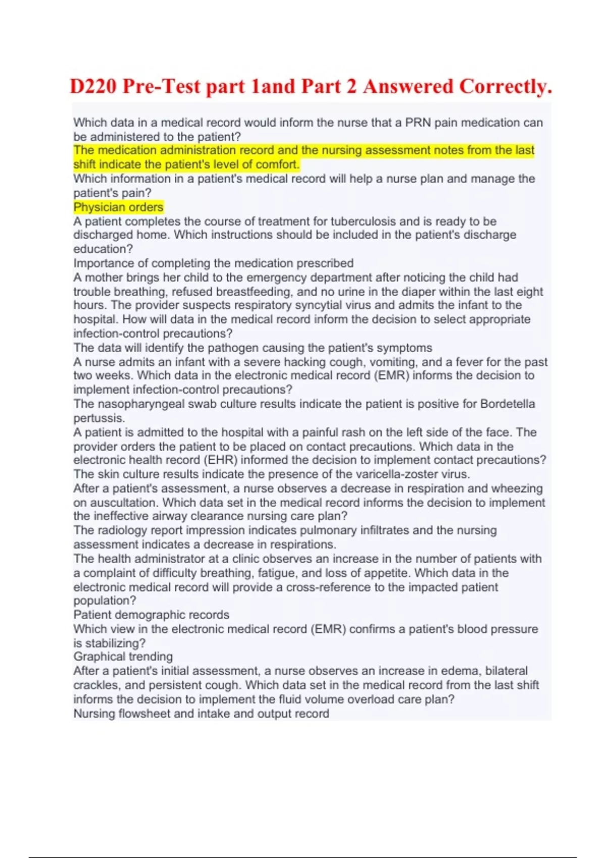 D220 Pre-Test part 1and Part 2 Answered Correctly.