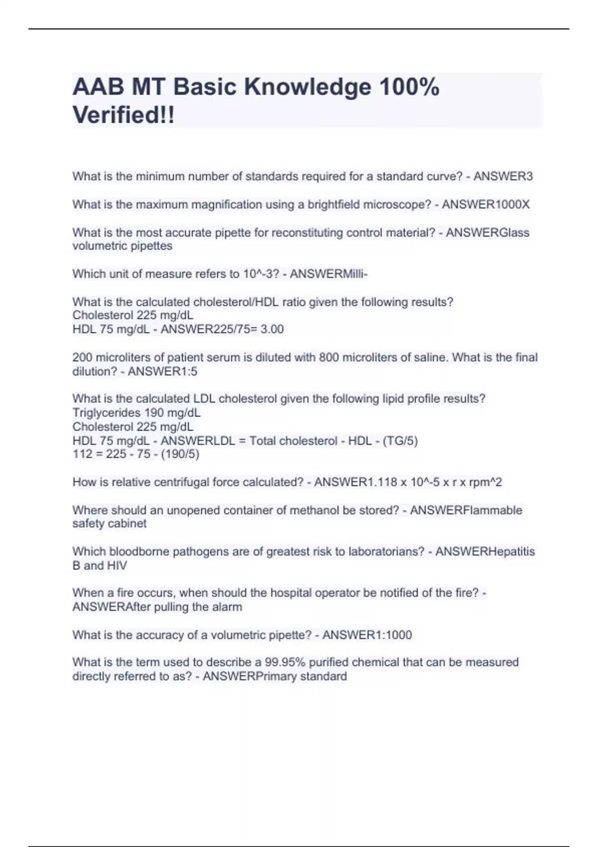 What is the minimum number of standards required for a standard curve? - ANSWER3 What is the maximum magnification using a brightfield microscope? - ANSWER1000X What is the most accurate pipette for reconstituting control material? - ANSWERGlass volumetric pipettes Which unit of measure refers to 10^-3? - ANSWERMilli- What is the calculated cholesterol/HDL ratio given the following results? Cholesterol 225 mg/dL HDL 75 mg/dL - ANSWER225/75= 3.00 200 microliters of patient serum is diluted with 800 microliters of saline. What is the final dilution? - ANSWER1:5 What is the calculated LDL cholesterol given the following lipid profile results? Triglycerides 190 mg/dL Cholesterol 225 mg/dL HDL 75 mg/dL - ANSWERLDL = Total cholesterol - HDL - (TG/5) 112 = 225 - 75 - (190/5) How is relative centrifugal force calculated? - ANSWER1.118 x 10^-5 x r x rpm^2 Where should an unopened container of methanol be stored? - ANSWERFlammable safety cabinet Which bloodborne pathogens are of greatest risk to laboratorians? - ANSWERHepatitis B and HIV When a fire occurs, when should the hospital operator be notified of the fire? - ANSWERAfter pulling the alarm What is the accuracy of a volumetric pipette? - ANSWER1:1000 What is the term used to describe a 99.95% purified chemical that can be measured directly referred to as? - ANSWERPrimary standard What is a solution in which the molecules of solute in the solution are in equilibrium with excess undissolved molecules referred to as? - ANSWERSaturated What is the pH of pure water? - ANSWER7.0 Which statistical term most specifically describes analytical precision? - ANSWERCoefficient of variation A procedure has a 2SD variation from a mean value. How many values from a normal population will 2SD include? - ANSWER95.45% To produce reliable results, how long should a patient fast before having blood drawn for lipid studies? - ANSWER12-16 hours How is a 10% bleach solution to disinfect the work area made? - ANSWER100 mL bleach added to 900 mL water Reactivity is what color diamond using the National Fire Protection Agency code? - ANSWERYellow What is a substance that minimizes any change in hydrogen ion concentration? - ANSWERBuffer Which type of specimen provides the fastest turnaround time? - ANSWERWhole blood If the mean for BUN is 18.0 and one standard deviation is 0.15, then what is the acceptable range for this control? - ANSWER17.7-18.3