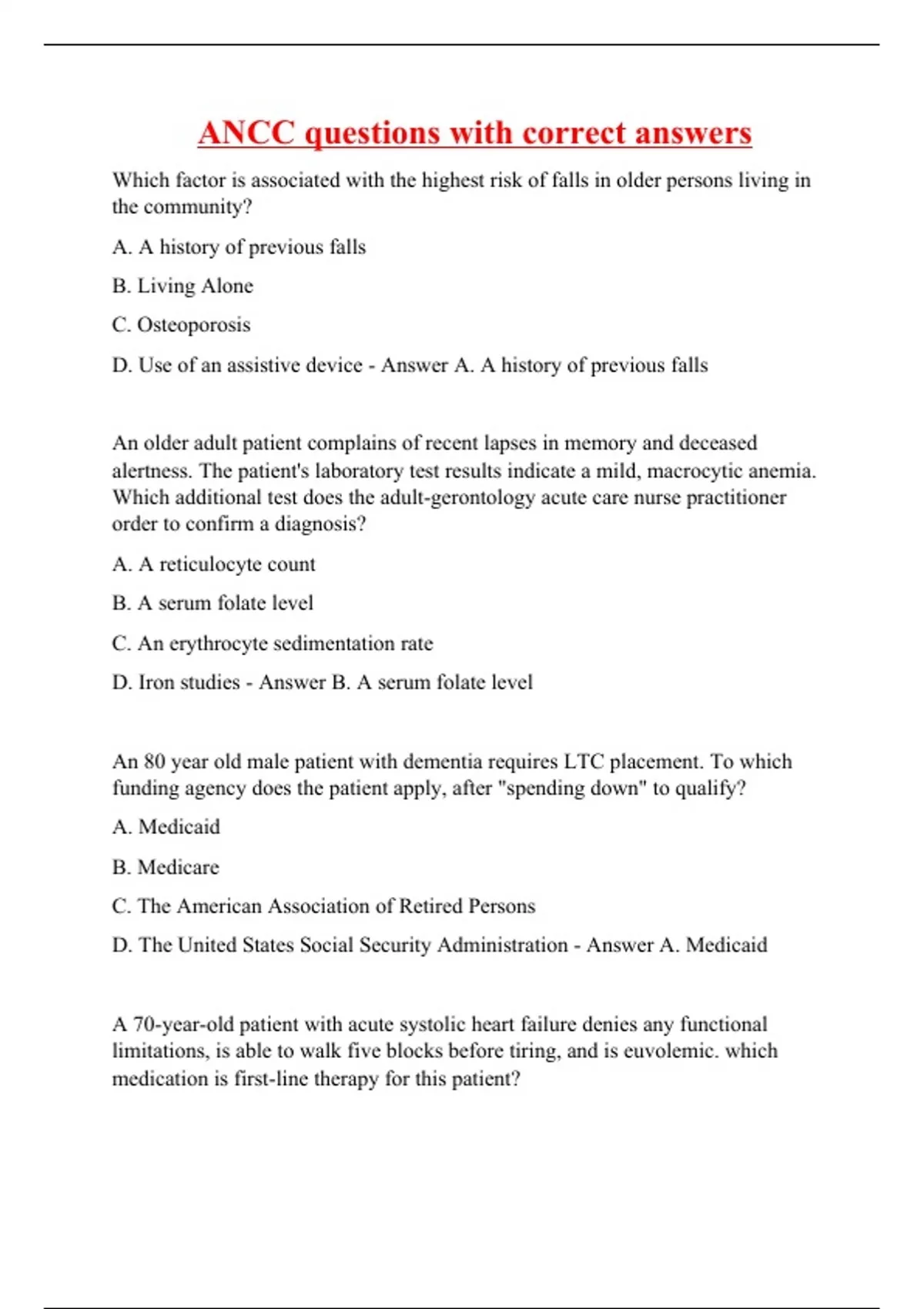 Which factor is associated with the highest risk of falls in older persons living in the community? A. A history of previous falls B. Living Alone C. Osteoporosis D. Use of an assistive device - Answer A. A history of previous falls An older adult patient complains of recent lapses in memory and deceased alertness. The patient's laboratory test results indicate a mild, macrocytic anemia. Which additional test does the adult-gerontology acute care nurse practitioner order to confirm a diagnosis? A. A reticulocyte count B. A serum folate level C. An erythrocyte sedimentation rate D. Iron studies - Answer B. A serum folate level An 80 year old male patient with dementia requires LTC placement. To which funding agency does the patient apply, after "spending down" to qualify? A. Medicaid B. Medicare C. The American Association of Retired Persons D. The United States Social Security Administration - Answer A. Medicaid