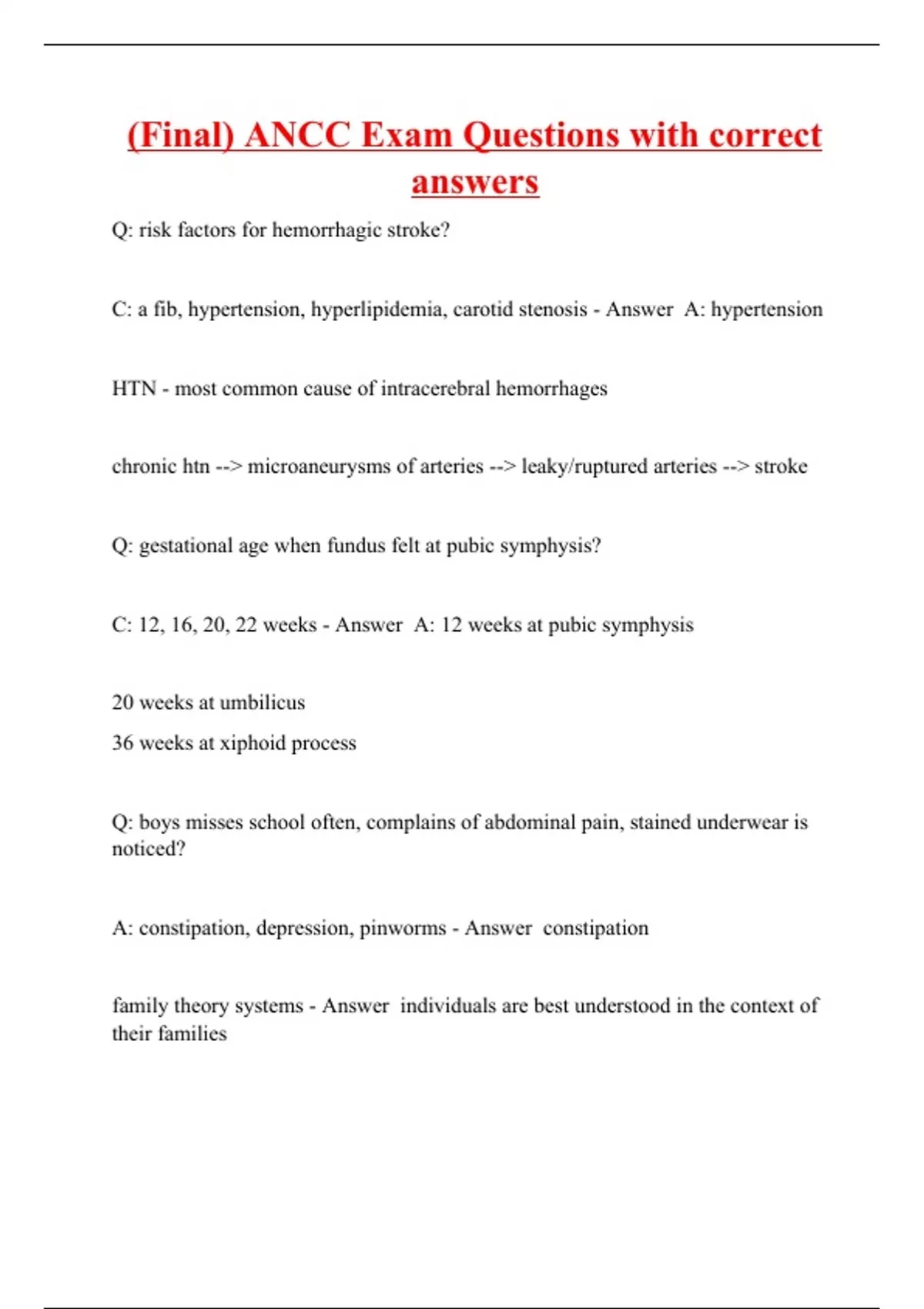 Q: risk factors for hemorrhagic stroke? C: a fib, hypertension, hyperlipidemia, carotid stenosis - Answer A: hypertension HTN - most common cause of intracerebral hemorrhages chronic htn --> microaneurysms of arteries --> leaky/ruptured arteries --> stroke Q: gestational age when fundus felt at pubic symphysis? C: 12, 16, 20, 22 weeks - Answer A: 12 weeks at pubic symphysis 20 weeks at umbilicus 36 weeks at xiphoid process Q: boys misses school often, complains of abdominal pain, stained underwear is noticed? A: constipation, depression, pinworms - Answer constipation family theory systems - Answer individuals are best understood