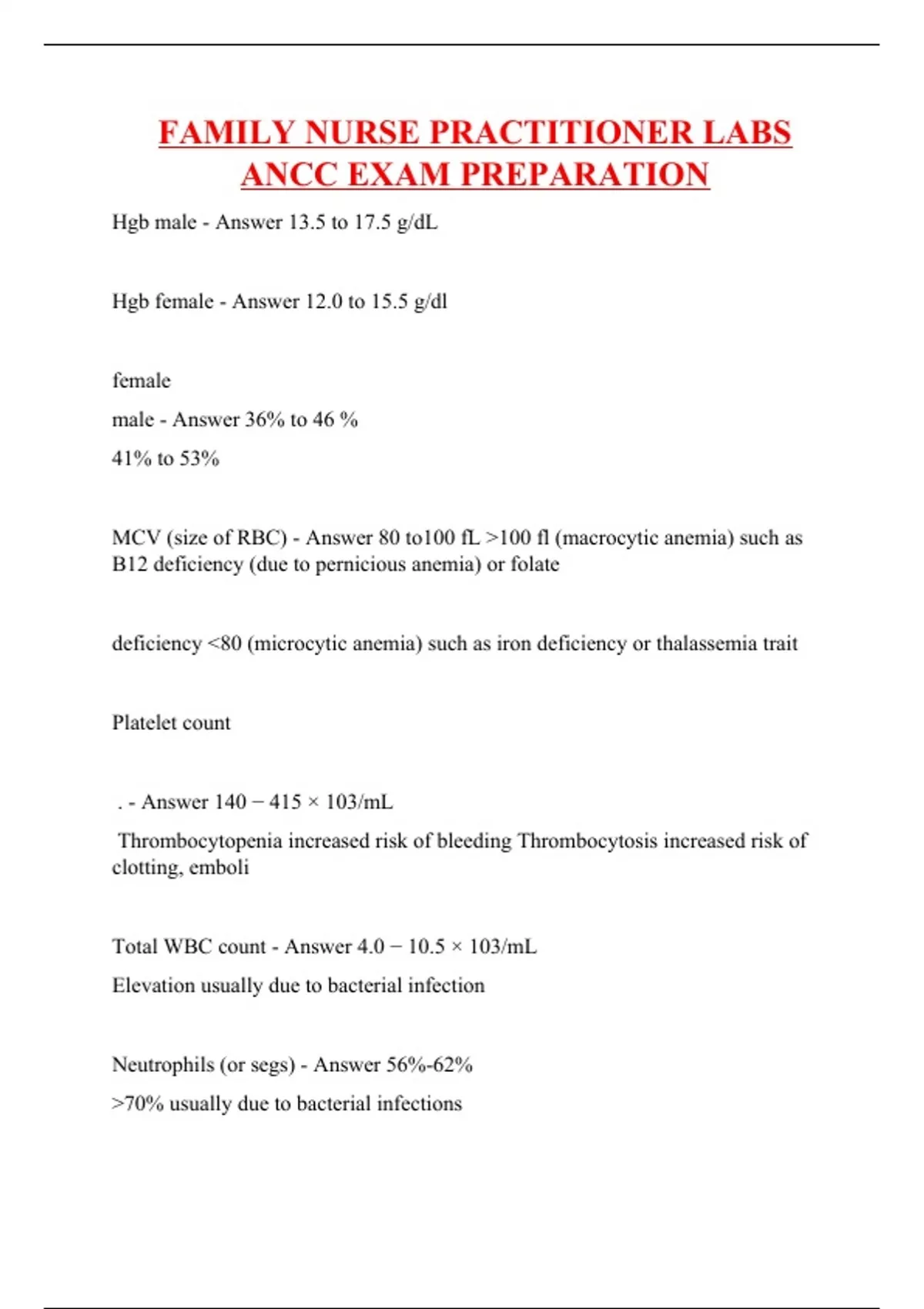 Hgb male - Answer 13.5 to 17.5 g/dL Hgb female - Answer 12.0 to 15.5 g/dl female male - Answer 36% to 46 % 41% to 53% MCV (size of RBC) - Answer 80 to100 fL >100 fl (macrocytic anemia) such as B12 deficiency (due to pernicious anemia) or folate deficiency <80 (microcytic anemia) such as iron deficiency or thalassemia trait Platelet count . - Answer 140 − 415 × 103/mL Thrombocytopenia increased risk of bleeding Thrombocytosis increased risk of clotting, emboli Total WBC count - Answer 4.0 − 10.5 × 103/mL Elevation usually due to bacterial infection Neutrophils (or segs) - Answer 56%-62% >70% usually due to bacterial infections