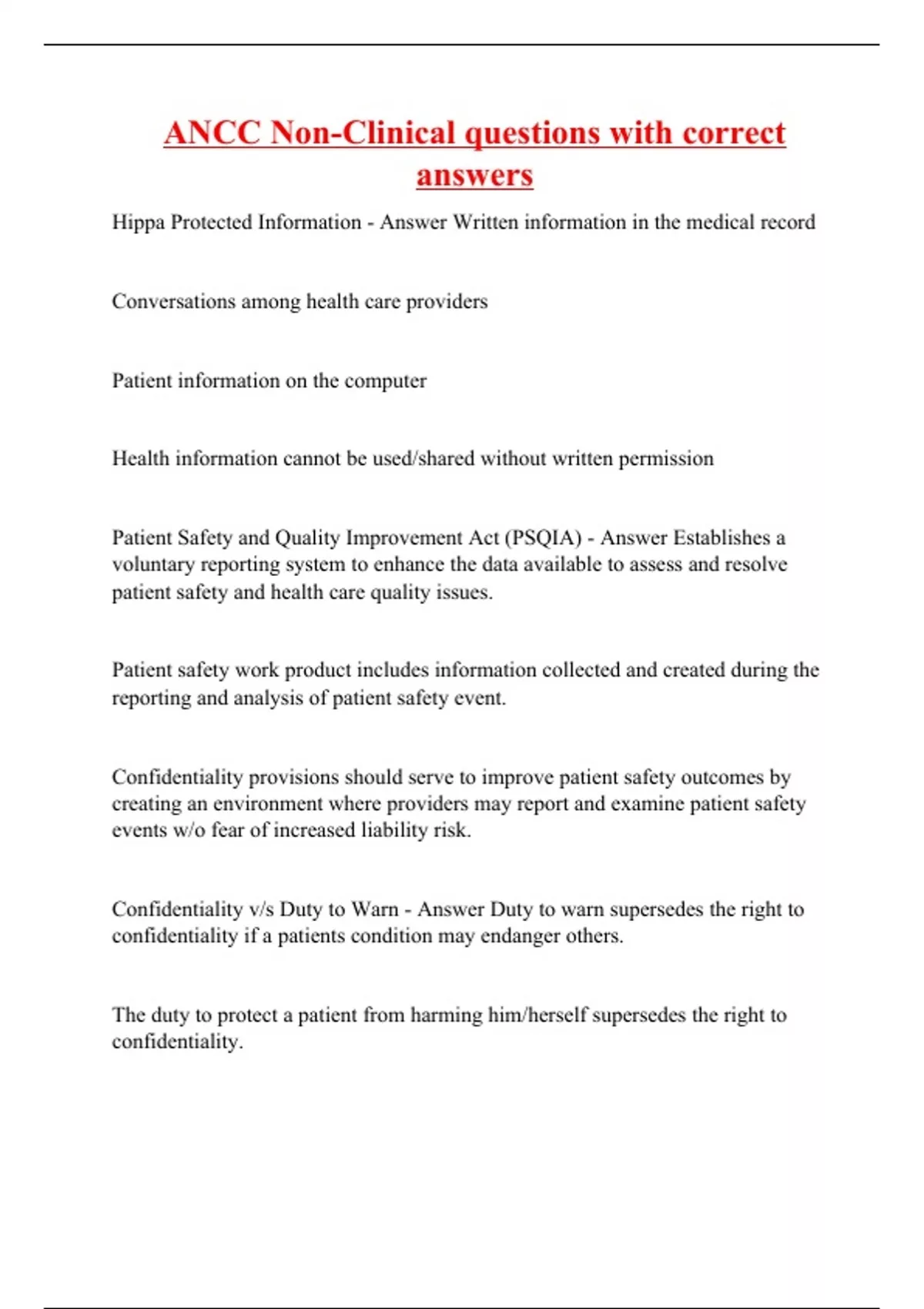 Hippa Protected Information - Answer Written information in the medical record Conversations among health care providers Patient information on the computer Health information cannot be used/shared without written permission Patient Safety and Quality Improvement Act (PSQIA) - Answer Establishes a voluntary reporting system to enhance the data available to assess and resolve patient safety and health care quality issues. Patient safety work product includes information collected and created during the reporting and analysis of patient safety event. Confidentiality provisions should serve to improve patient safety outcomes by creating an environment where providers may report and examine patient safety events w/o fear of increased liability risk. Confidentiality v/s Duty to Warn - Answer Duty to warn supersedes the right to confidentiality if a patients condition may endanger others. The duty to protect a patient from harming him/herself supersedes the right to confidentiality. Invasion of Privacy - Answer If the information can be shown to