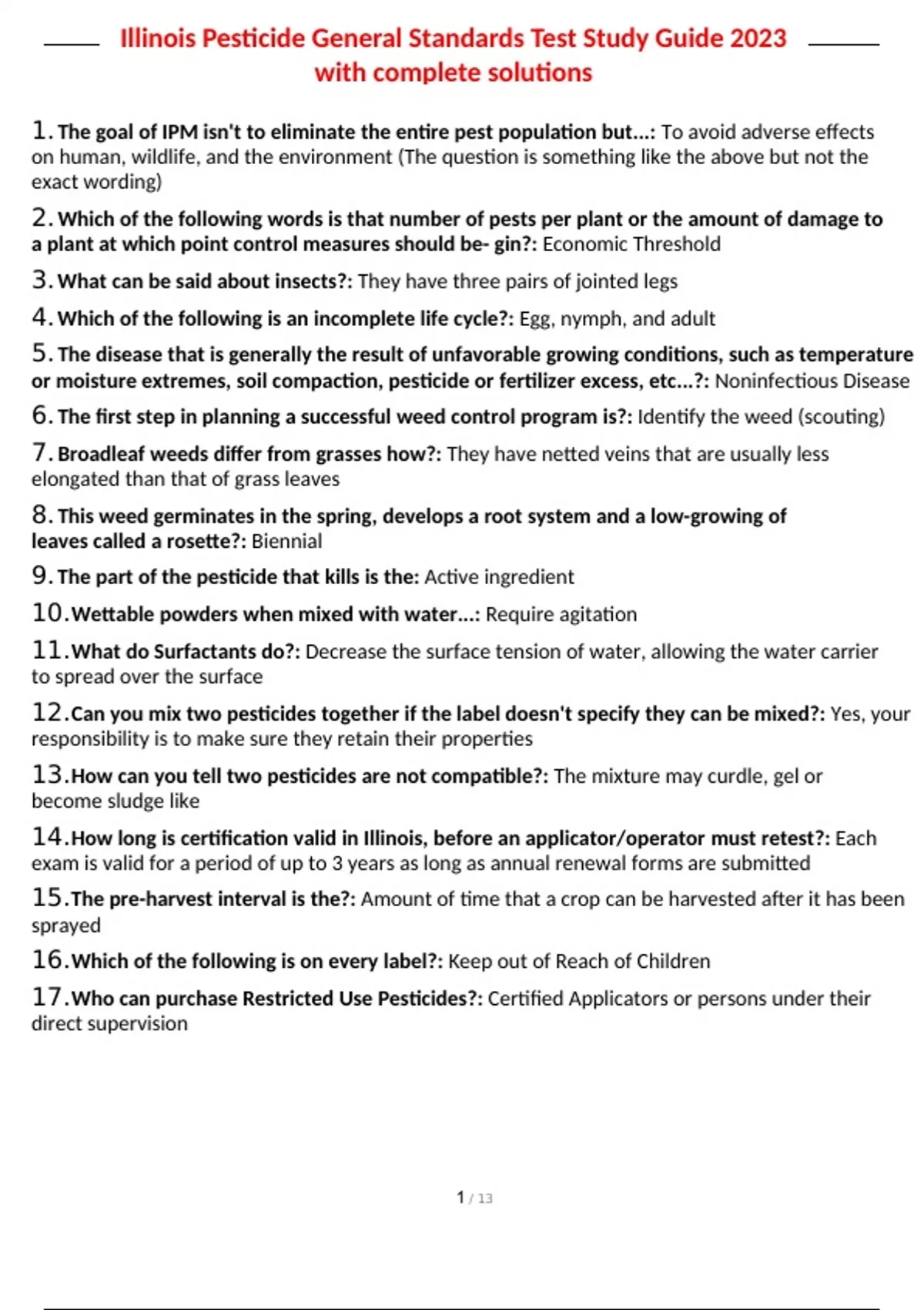 1. The goal of IPM isn't to eliminate the entire pest population but...: To avoid adverse effects on human, wildlife, and the environment (The question is something like the above but not the exact wording) 2. Which of the following words is that number of pests per plant or the amount of damage to a plant at which point control measures should be- gin?: Economic Threshold 3. What can be said about insects?: They have three pairs of jointed legs 4. Which of the following is an incomplete life cycle?: Egg, nymph, and adult 5. The disease that is generally the result of unfavorable growing conditions, such as temperature or moisture extremes, soil compaction, pesticide or fertilizer excess, etc...?: Noninfectious Disease 6. The first step in planning a successful weed control program is?: Identify the weed (scouting) 7. Broadleaf weeds differ from grasses how?: They have netted veins that are usually less elongated than that of grass leaves 8. This weed germinates in the spring, develops a root system and a low-growing of leaves called a rosette?: Biennial 9. The part of the pesticide that kills is the: Active ingredient 10. Wettable powders when mixed with water...: Require agitation 11. What do Surfactants do?: Decrease the surface tension of water, allowing the water carrier to spread over the surface 12. Can you mix two pesticides together if the label doesn't specify they can be mixed?: Yes, your responsibility is to make sure they retain their properties 13. How can you tell two pesticides are not compatible?: The mixture may curdle, gel or become sludge like 14. How long is certification valid in Illinois, before an applicator/operator must retest?: Each exam is valid for a period of up to 3 years as long as annual renewal forms are submitted 15. The pre-harvest interval is the?: Amount of time that a crop can be harvested after it has been sprayed 16. Which of the following is on every label?: Keep out of Reach of Children 17. Who can purchase Restricted Use Pesticides?: Certified Applicators or persons under their direct supervision 18. What part of the label should you look under to find the minimum PPE you should wear?: Precautionary Statement 19. How often should you read the pesticide label?: Every time you purchase the product- can be used up to the phase out date 20. The Office of Safety and Health Administration protects the nation's workers through dissemination of information...: "Worker Right-to-Know" 21. Which of the following dermal exposure is the most serious?: When a pesticide mixed with OIL crosses skin barrier and into the bloodstream, the result can be fatal 22. If you spill highly concentrated chemicals on your clothes how should you clean them?: Don't, dispose of them properly 23. When filling, rinsing, draining, and cleaning your equipment preferably the area should have?: A wash pad, wash rack, or concentrate apron with a well designed sump to catch contaminated water 24. What is the best way to get rid of excess chemical?: Dilute excess and reapply to area, but do not exceed label rates for area 25. What is a major concern of drift?: Off target damage to a vegetation and people 26. Which of the following is important to consider when purchasing and applying a pesticide? a. The label of a legal document b. Before you buy and apply a pesticide read the label c. A General Use Pesticide is not given a classification on the label d. All of the above: All of the above 27. What is a major complaint to the Dept. of Agriculture about spraying?: - Drift from farms, etc 28. If you were going to spray an area and there are bee colonies with-in two miles what should you do?: Contact the bee keepers 48 hrs. in advance so the colonies can be moved 29. When is the best time to spray if bees are in the area?: Dawn and dusk 30. Must be used with special caution near bee hives, since bees may carry them back to the hive and poison the entire colony?: Microencapsulated herbicide 31. How would you determine if the pesticide you are using is prone to volatilization?: Check the label, often indicates