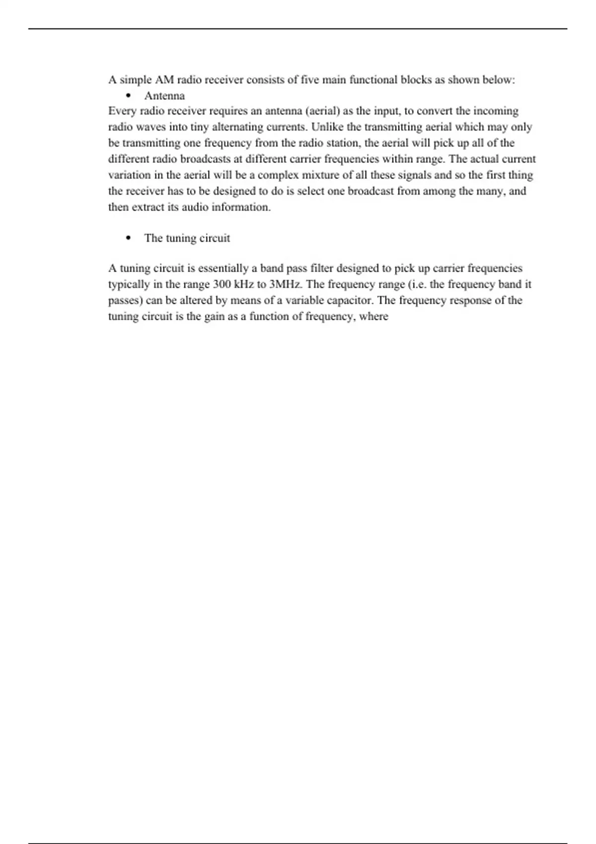 A simple AM radio receiver consists of five main functional blocks as shown below: