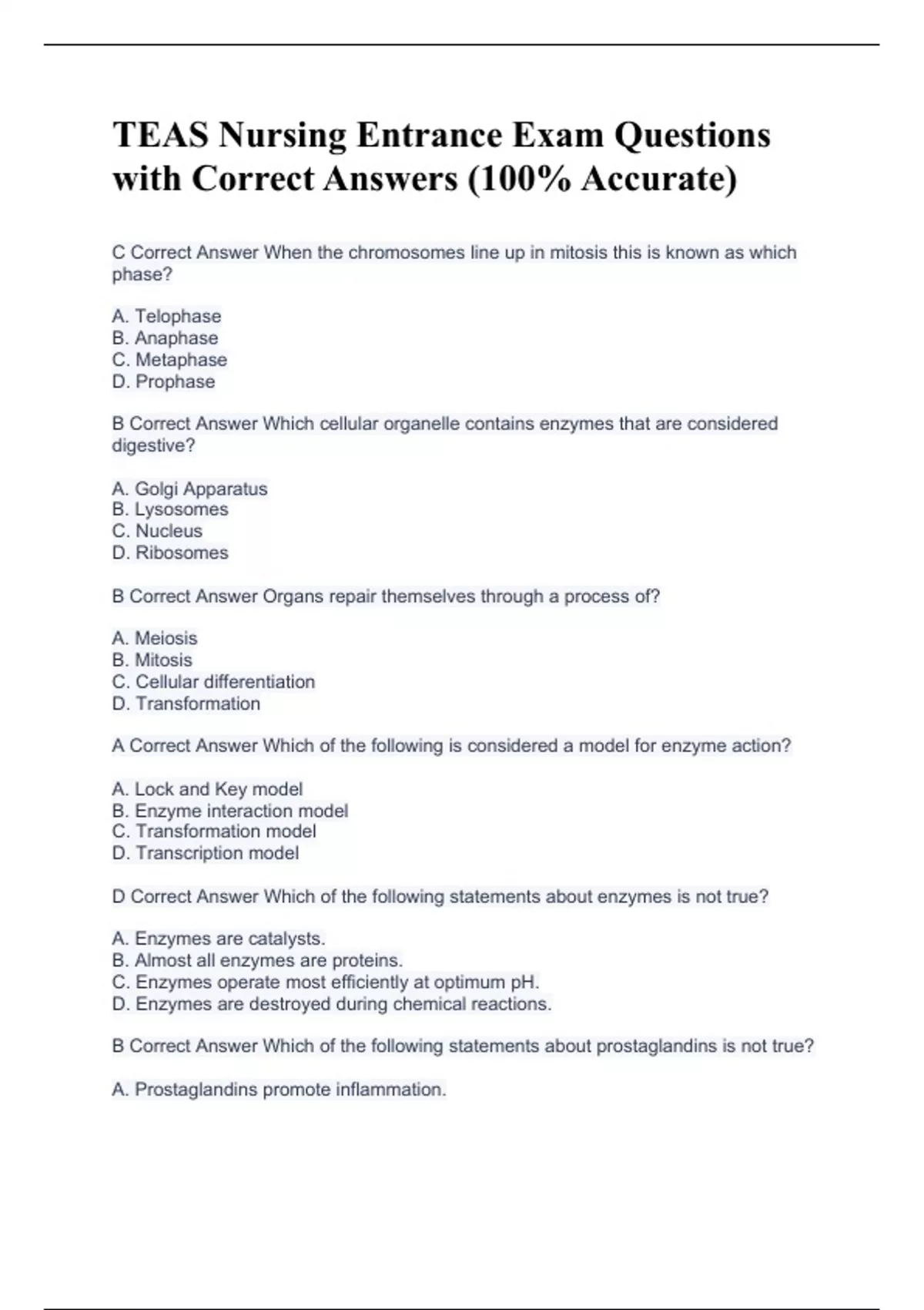 C Correct Answer When the chromosomes line up in mitosis this is known as which phase? A. Telophase B. Anaphase C. Metaphase D. Prophase B Correct Answer Which cellular organelle contains enzymes that are considered digestive? A. Golgi Apparatus B. Lysosomes C. Nucleus D. Ribosomes B Correct Answer Organs repair themselves through a process of? A. Meiosis B. Mitosis C. Cellular differentiation D. Transformation A Correct Answer Which of the following is considered a model for enzyme action? A. Lock and Key model B. Enzyme interaction model C. Transformation model D. Transcription model D Correct Answer Which of the following statements about enzymes is not true? A. Enzymes are catalysts. B. Almost all enzymes are proteins. C. Enzymes operate most efficiently at optimum pH. D. Enzymes are destroyed during chemical reactions. B Correct Answer Which of the following statements about prostaglandins is not true? A. Prostaglandins promote inflammation.