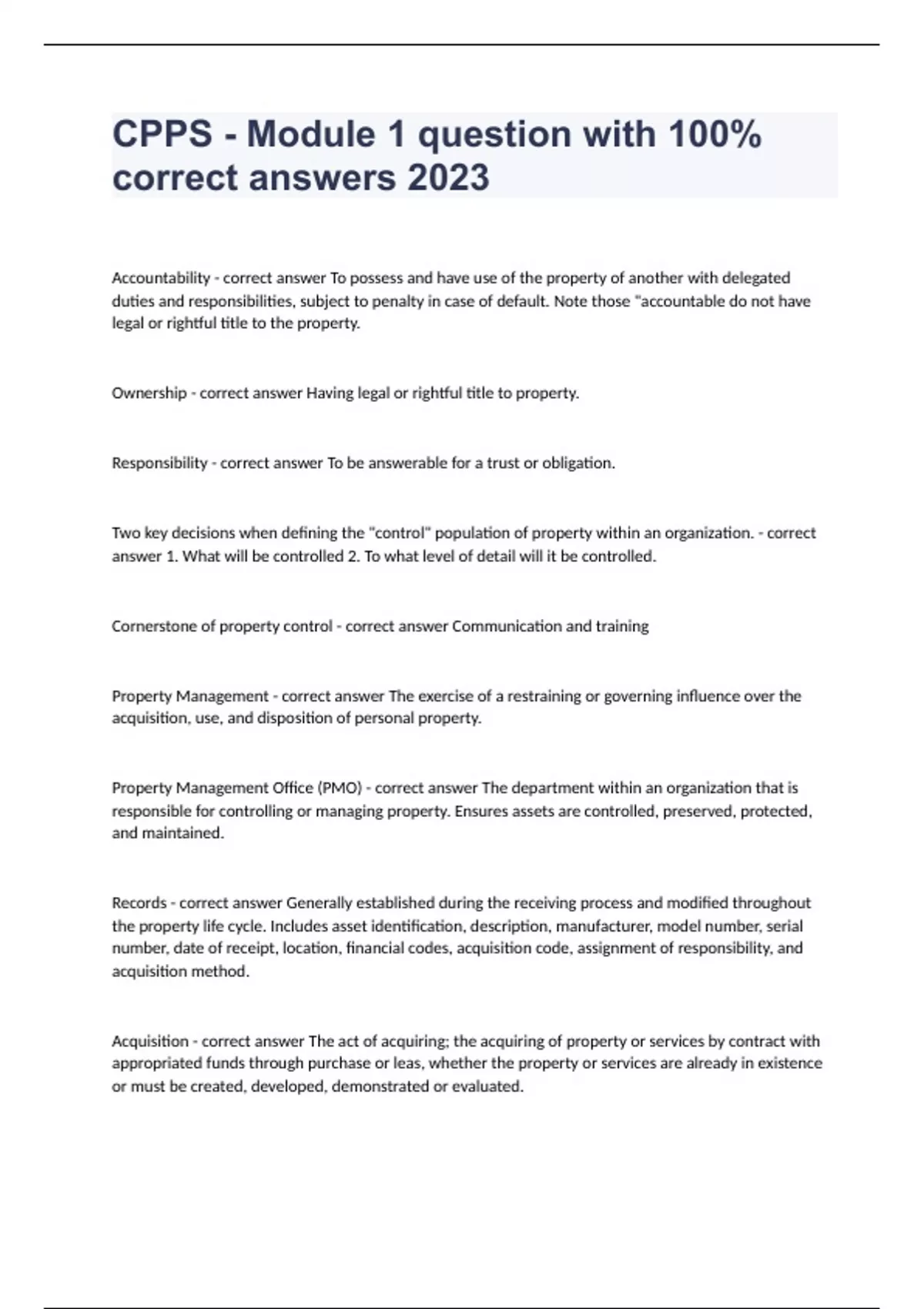 CPPS - Module 1 question with 100% correct answers 2023Accountability - correct answer To possess and have use of the property of another with delegated duties and responsibilities, subject to penalty in case of default. Note those "accountable do not have legal or rightful title to the property. Ownership - correct answer Having legal or rightful title to property. Responsibility - correct answer To be answerable for a trust or obligation. Two key decisions when defining the "control" population of property within an organization. - correct answer 1. What will be controlled 2. To what level of detail will it be controlled. Cornerstone of property control - correct answer Communication and training Property Management - correct answer The exercise of a restraining or governing influence over the acquisition, use, and disposition of personal property. Property Management Office (PMO) - correct answer The department within an organization that is responsible for controlling or managing property. Ensures assets are controlled, preserved, protected, and maintained. Records - correct answer Generally established during the receiving process and modified throughout the property life cycle. Includes asset identification, description, manufacturer, model number, serial number, date of receipt, location, financial codes, acquisition code, assignment of responsibility, and acquisition method. Acquisition - correct answer The act of acquiring; the acquiring of property or services by contract with appropriated funds through purchase or leas, whether the property or services are already in existence or must be created, developed, demonstrated or evaluated.