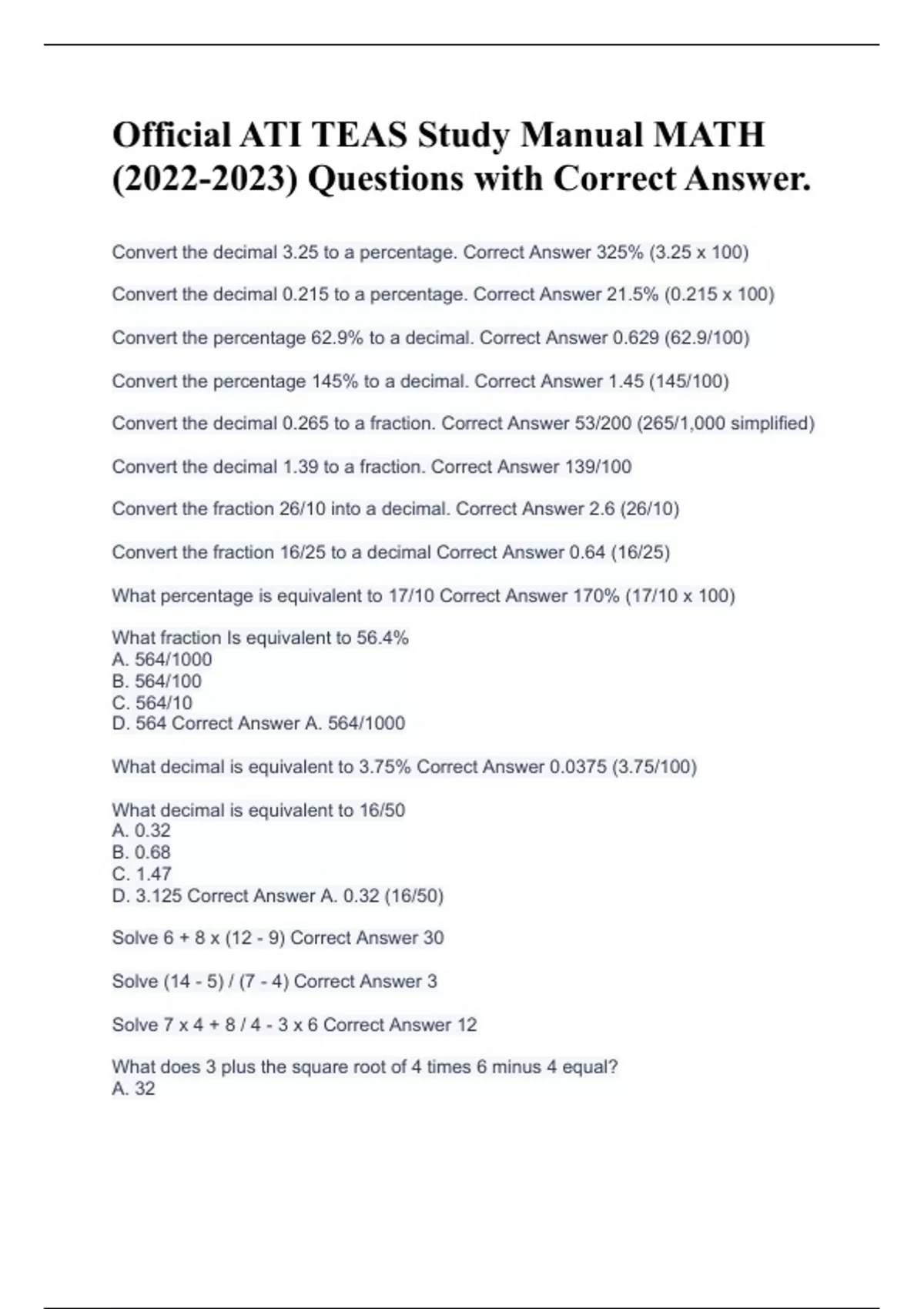 Official ATI TEAS Study Manual MATH () Questions with Correct Answer.