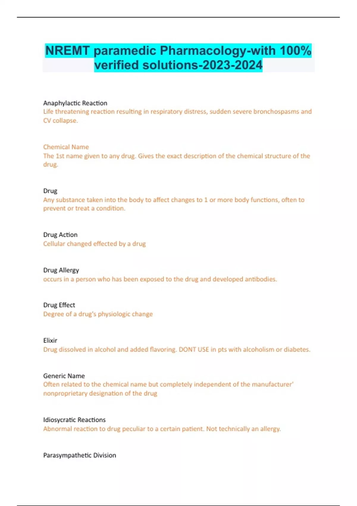 NREMT paramedic Pharmacology-with 100% verified solutions-