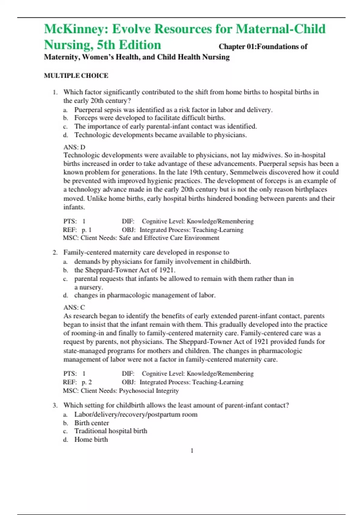 McKinney: Evolve Resources for Maternal-Child Nursing, 5th Edition Chapter 01:Foundations of Maternity, Women’s Health, and Child Health Nursing MULTIPLE CHOICE 1. Which factor significantly contributed to the shift from home births to hospital births in the early 20th century? a. Puerperal sepsis was identified as a risk factor in labor and delivery. b. Forceps were developed to facilitate difficult births. c. The importance of early parental-infant contact was identified. d. Technologic developments became available to physicians. ANS: D Technologic developments were available to physicians, not lay midwives. So in-hospital births increased in order to take advantage of these advancements. Puerperal sepsis has been a known problem for generations. In the late 19th century, Semmelweis discovered how it could be prevented with improved hygienic practices. The development of forceps is an example of a technology advance made in the early 20th century but is not the only reason birthplaces moved. Unlike home births, early hospital births hindered bonding between parents and their infants. PTS: 1 DIF: Cognitive Level: Knowledge/Remembering REF: p. 1 OBJ: Integrated Process: Teaching-Learning MSC: Client Needs: Safe and Effective Care Environment 2. Family-centered maternity care developed in response to a. demands by physicians for family involvement in childbirth. b. the Sheppard-Towner Act of 1921. c. parental requests that infants be allowed to remain with them rather than in a nursery. d. changes in pharmacologic management of labor. ANS: C As research began to identify the benefits of early extended parent-infant contact, parents began to insist that the infant remain with them. This gradually developed into the practice of rooming-in and finally to family-centered maternity care. Family-centered care was a request by parents, not physicians. The Sheppard-Towner Act of 1921 provided funds for state-managed programs for mothers and children. The changes in pharmacologic management of labor were not a factor in family-centered maternity care. PTS: 1 DIF: Cognitive Level: Knowledge/Remembering REF: p. 2 OBJ: Integrated Process: Teaching-Learning MSC: Client Needs: Psychosocial Integrity 3. Which setting for childbirth allows the least amount of parent-infant contact? a. Labor/delivery/recovery/postpartum room b. Birth center c. Traditional hospital birth d. Home birth . ANS: C In the traditional hospital setting, the mother may see the infant for only short feeding periods, and the infant is cared for in a separate nursery. The labor/delivery/recovery/postpartum room setting allows increased parent-infant contact. Birth centers are set up to allow an increase in parent-infant contact. Home births allow an increase in parent-infant contact. PTS: 1 DIF: Cognitive Level: Knowledge/Remembering REF: p. 2 OBJ: Nursing Process: Planning MSC: Client Needs: Health Promotion and Maintenance 4. As a result of changes in health care delivery and funding, a current trend seen in the pediatric setting is a. increased hospitalization of children. b. decreased number of children living in poverty. c. an increase in ambulatory care. d. decreased use of managed care. ANS: C One effect of managed care has been that pediatric health care delivery has shifted dramatically from the acute care setting to the ambulatory setting in order to provide more cost-efficient care. The number of hospital beds being used has decreased as more care is given in outpatient settings and in the home. The number of children living in poverty has increased over the past decade. One of the biggest changes in health care has been the growth of managed care. PTS: 1 DIF: Cognitive Level: Knowledge/Remembering REF: p. 5 OBJ: Nursing Process: Planning MSC: Client Needs: Safe and Effective Care Environment 5. The Women, Infants, and Children (WIC) program provides a. well-child examinations for infants and children living at the poverty level. b. immunizations for high-risk infants and children. c. screening for infants with developmental disorders. d. supplemental food supplies to low-income pregnant or breastfeeding women. ANS: D WIC is a federal program that provides supplemental food supplies to low-income women who are pregnant or breastfeeding and to their children until age 5 years. Medicaid’s Early and Periodic Screening, Diagnosis, and Treatment Program provides for well-child examinations and for treatment of any medical problems diagnosed during such checkups. Children in the WIC program are often referred for immunizations, but that is not the primary focus of the program. Public Law 99-457 is part of the Individuals with Disabilities Education Act that provides financial incentives to states to establish comprehensive early intervention services for infants and toddlers with, or at risk for, developmental disabilities. PTS: 1 DIF: Cognitive Level: Comprehension OBJ: Integrated Process: Teaching-Learning MSC: Client Needs: Health Promotion and Maintenance REF: p. 8 6. In most states, adolescents who are not emancipated minors must have the permission of their parents before . a. treatment for drug abuse. b. treatment for sexually transmitted diseases (STDs). c. accessing birth control. d. surgery. ANS: D Minors are not considered capable of giving informed consent, so a surgical procedure would require consent of the parent or guardian. Exceptions exist for obtaining treatment for drug abuse or STDs or for getting birth control in most states. PTS: 1 DIF: Cognitive Level: Knowledge/Remembering REF: p. 17 OBJ: Nursing Process: Planning MSC: Client Needs: Safe and Effective Care Environment 7. The maternity nurse should have a clear understanding of the correct use of a clinical pathway. One characteristic of clinical pathways is that they a. are developed and implemented by nurses. b. are used primarily in the pediatric setting. c. set specific time lines for sequencing interventions. d. are part of the nursing process. 