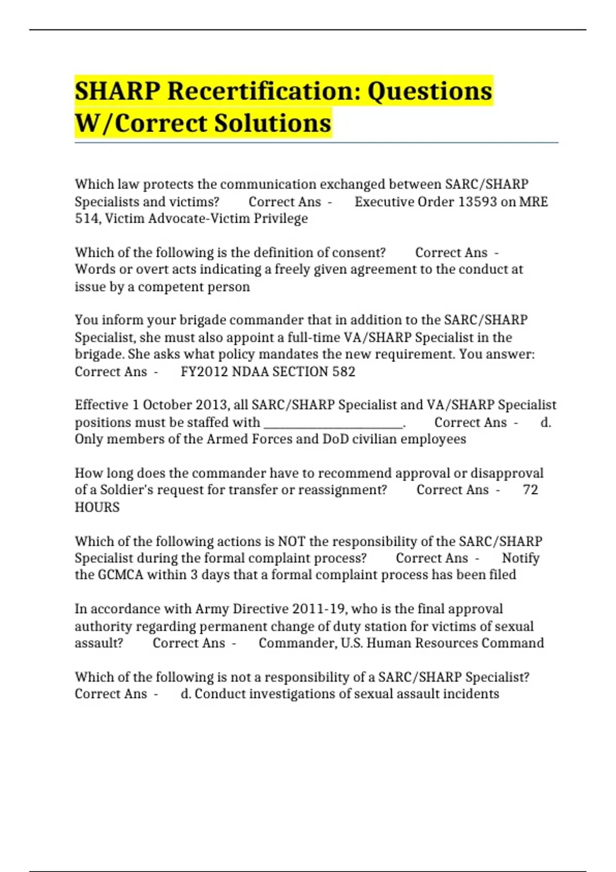 SHARP Recertification: Questions W/Correct Solutions