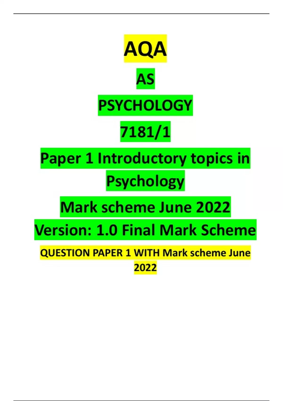 AS PSYCHOLOGY 7181/1 Paper 1 Introductory topics in Psychology Mark scheme June 2022 Version: 1.0 Final Mark Scheme