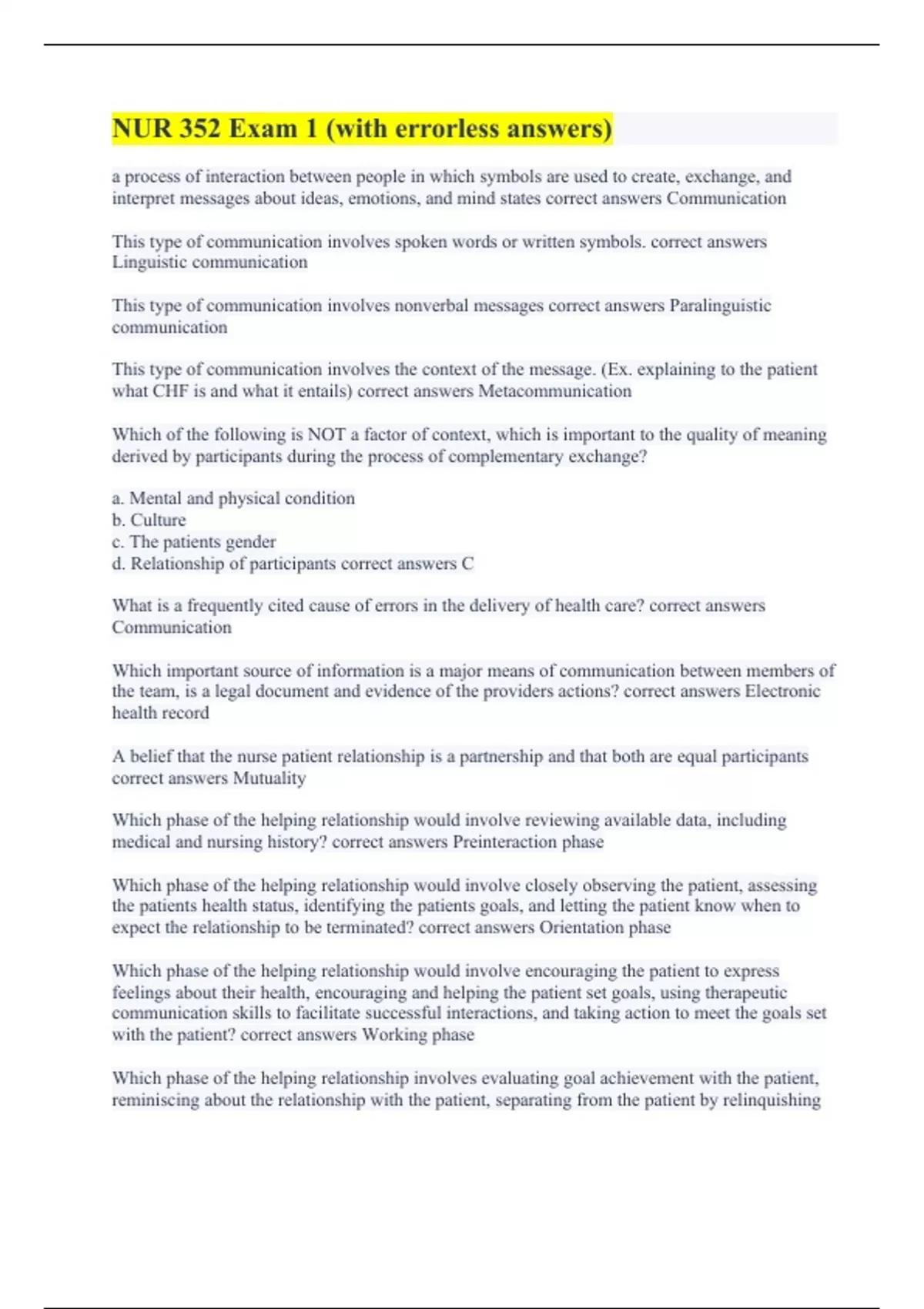a process of interaction between people in which symbols are used to create, exchange, and interpret messages about ideas, emotions, and mind states correct answers Communication This type of communication involves spoken words or written symbols. correct answers Linguistic communication This type of communication involves nonverbal messages correct answers Paralinguistic communication This type of communication involves the context of the message. (Ex. explaining to the patient what CHF is and what it entails) correct answers Metacommunication Which of the following is NOT a factor of context, which is important to the quality of meaning derived by participants during the process of complementary exchange? a. Mental and physical condition b. Culture c. The patients gender d. Relationship of participants correct answers C What is a frequently cited cause of errors in the delivery of health care? correct answers Communication Which important source of information is a major means of communication between members of the team, is a legal document and evidence of the providers actions? correct answers Electronic health record A belief that the nurse patient relationship is a partnership and that both are equal participants correct answers Mutuality Which phase of the helping relationship would involve reviewing available data, including medical and nursing history? correct answers Preinteraction phase Which phase of the helping relationship would involve closely observing the patient, assessing the patients health status, identifying the patients goals, and letting the patient know when to expect the relationship to be terminated? correct answers Orientation phase Which phase of the helping relationship would involve encouraging the patient to express feelings about their health, encouraging and helping the patient set goals, using therapeutic communication skills to facilitate successful interactions, and taking action to meet the goals set with the patient? correct answers Working phase Which phase of the helping relationship involves evaluating goal achievement with the patient, reminiscing about the relationship with the patient, separating from the patient by relinquishing