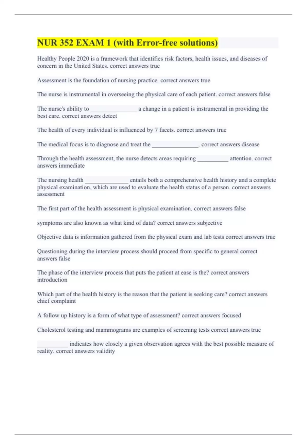 Healthy People 2020 is a framework that identifies risk factors, health issues, and diseases of concern in the United States. correct answers true Assessment is the foundation of nursing practice. correct answers true The nurse is instrumental in overseeing the physical care of each patient. correct answers false The nurse's ability to _______________ a change in a patient is instrumental in providing the best care. correct answers detect The health of every individual is influenced by 7 facets. correct answers true The medical focus is to diagnose and treat the _______________. correct answers disease Through the health assessment, the nurse detects areas requiring __________ attention. correct answers immediate The nursing health ______________ entails both a comprehensive health history and a complete physical examination, which are used to evaluate the health status of a person. correct answers assessment The first part of the health assessment is physical examination. correct answers false symptoms are also known as what kind of data? correct answers subjective Objective data is information gathered from the physical exam and lab tests correct answers true Questioning during the interview process should proceed from specific to general correct answers false The phase of the interview process that puts the patient at ease is the? correct answers introduction Which part of the health history is the reason that the patient is seeking care? correct answers chief complaint A follow up history is a form of what type of assessment? correct answers focused Cholesterol testing and mammograms are examples of screening tests correct answers true __________ indicates how closely a given observation agrees with the best possible measure of reality. correct answers validity