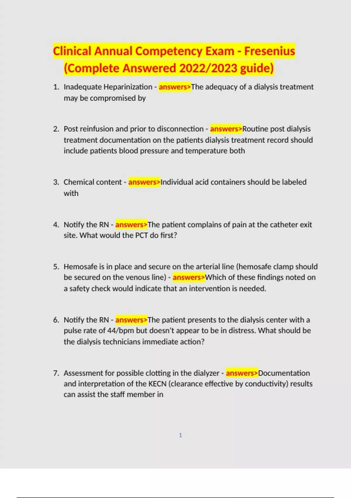 Clinical Annual Competency Exam - Fresenius (Complete Answered 2022/2023 guide)