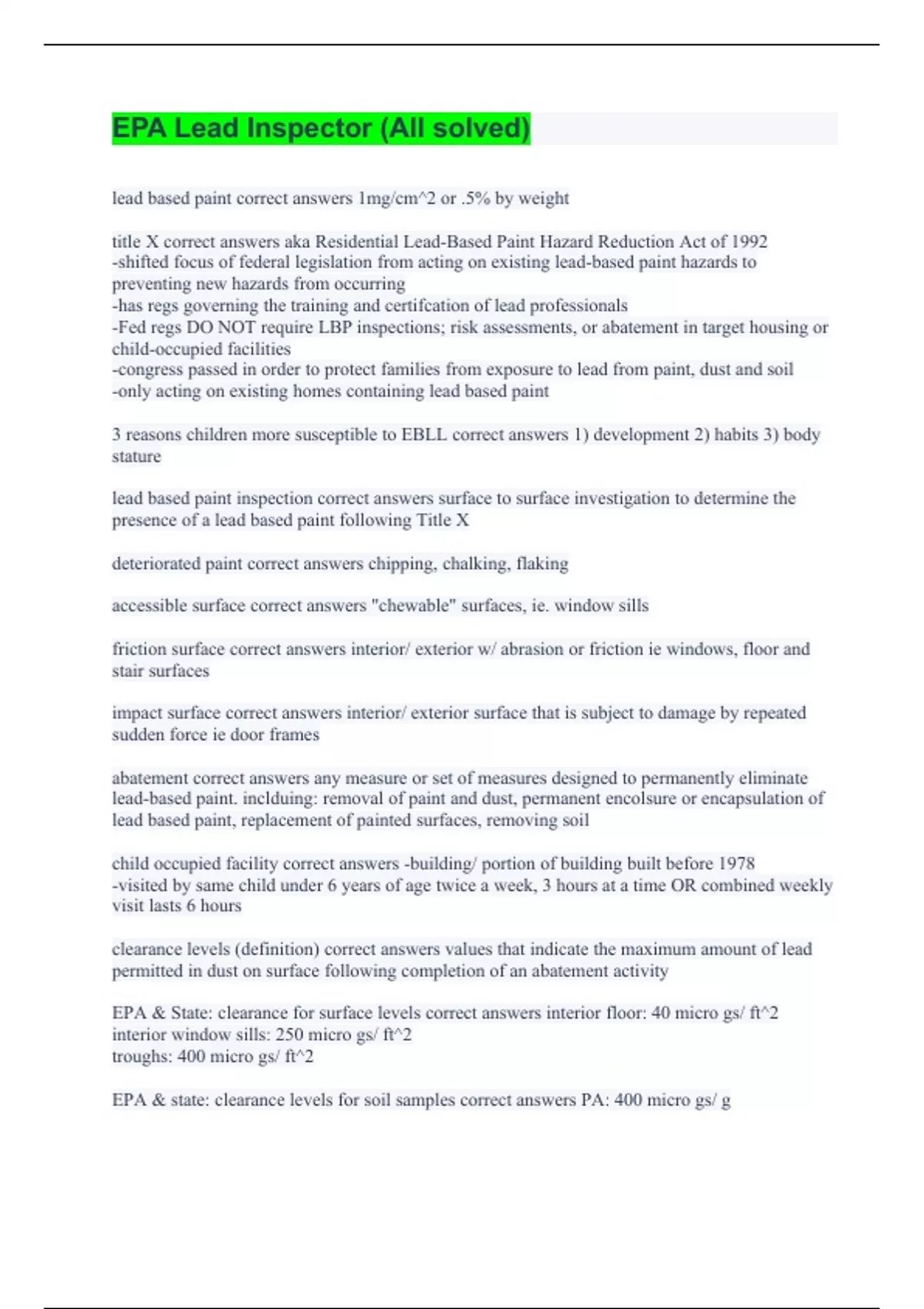 lead based paint correct answers 1mg/cm^2 or .5% by weight title X correct answers aka Residential Lead-Based Paint Hazard Reduction Act of 1992 -shifted focus of federal legislation from acting on existing lead-based paint hazards to preventing new hazards from occurring -has regs governing the training and certifcation of lead professionals -Fed regs DO NOT require LBP inspections; risk assessments, or abatement in target housing or child-occupied facilities -congress passed in order to protect families from exposure to lead from paint, dust and soil -only acting on existing homes containing lead based paint 3 reasons children more susceptible to EBLL correct answers 1) development 2) habits 3) body stature lead based paint inspection correct answers surface to surface investigation to determine the presence of a lead based paint following Title X deteriorated paint correct answers chipping, chalking, flaking accessible surface correct answers "chewable" surfaces, ie. window sills friction surface correct answers interior/ exterior w/ abrasion or friction ie windows, floor and stair surfaces impact surface correct answers interior/ exterior surface that is subject to damage by repeated sudden force ie door frames abatement correct answers any measure or set of measures designed to permanently eliminate lead-based paint. inclduing: removal of paint and dust, permanent encolsure or encapsulation of lead based paint, replacement of painted surfaces, removing soil child occupied facility correct answers -building/ portion of building built before 1978 -visited by same child under 6 years of age twice a week, 3 hours at a time OR combined weekly visit lasts 6 hours clearance levels (definition) correct answers values that indicate the maximum amount of lead permitted in dust on surface following completion of an abatement activity EPA & State: clearance for surface levels correct answers interior floor: 40 micro gs/ ft^2 interior window sills: 250 micro gs/ ft^2 troughs: 400 micro gs/ ft^2 EPA & state: clearance levels for soil samples correct answers PA: 400 micro gs/ g