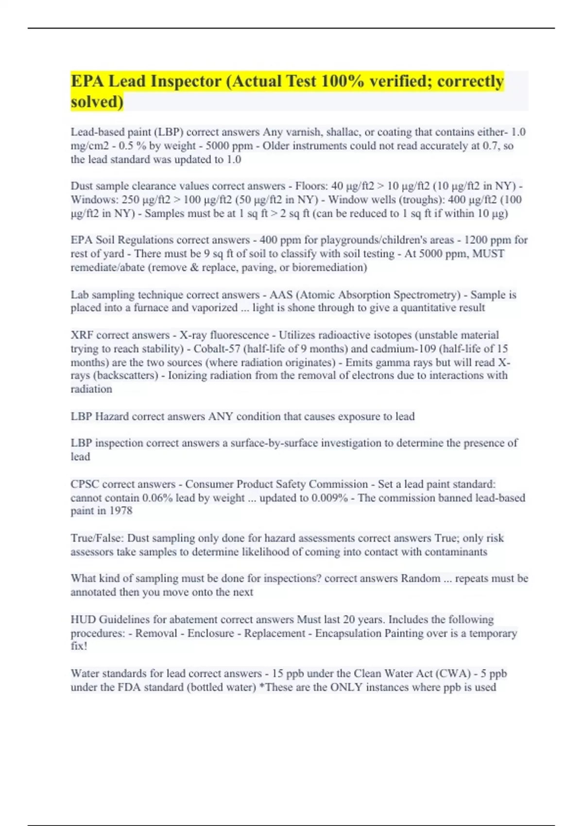 Lead-based paint (LBP) correct answers Any varnish, shallac, or coating that contains either- 1.0 mg/cm2 - 0.5 % by weight - 5000 ppm - Older instruments could not read accurately at 0.7, so the lead standard was updated to 1.0 Dust sample clearance values correct answers - Floors: 40 μg/ft2 > 10 μg/ft2 (10 μg/ft2 in NY) - Windows: 250 μg/ft2 > 100 μg/ft2 (50 μg/ft2 in NY) - Window wells (troughs): 400 μg/ft2 (100 μg/ft2 in NY) - Samples must be at 1 sq ft > 2 sq ft (can be reduced to 1 sq ft if within 10 μg) EPA Soil Regulations correct answers - 400 ppm for playgrounds/children's areas - 1200 ppm for rest of yard - There must be 9 sq ft of soil to classify with soil testing - At 5000 ppm, MUST remediate/abate (remove & replace, paving, or bioremediation) Lab sampling technique correct answers - AAS (Atomic Absorption Spectrometry) - Sample is placed into a furnace and vaporized ... light is shone through to give a quantitative result XRF correct answers - X-ray fluorescence - Utilizes radioactive isotopes (unstable material trying to reach stability) - Cobalt-57 (half-life of 9 months) and cadmium-109 (half-life of 15 months) are the two sources (where radiation originates) - Emits gamma rays but will read X-rays (backscatters) - Ionizing radiation from the removal of electrons due to interactions with radiation LBP Hazard correct answers ANY condition that causes exposure to lead LBP inspection correct answers a surface-by-surface investigation to determine the presence of lead CPSC correct answers - Consumer Product Safety Commission - Set a lead paint standard: cannot contain 0.06% lead by weight ... updated to 0.009% - The commission banned lead-based paint in 1978 True/False: Dust sampling only done for hazard assessments correct answers True; only risk assessors take samples to determine likelihood of coming into contact with contaminants What kind of sampling must be done for inspections? correct answers Random ... repeats must be annotated then you move onto the next HUD Guidelines for abatement correct answers Must last 20 years. Includes the following procedures: - Removal - Enclosure - Replacement - Encapsulation Painting over is a temporary fix! Water standards for lead correct answers - 15 ppb under the Clean Water Act (CWA) - 5 ppb under the FDA standard (bottled water) *These are the ONLY instances where ppb is used