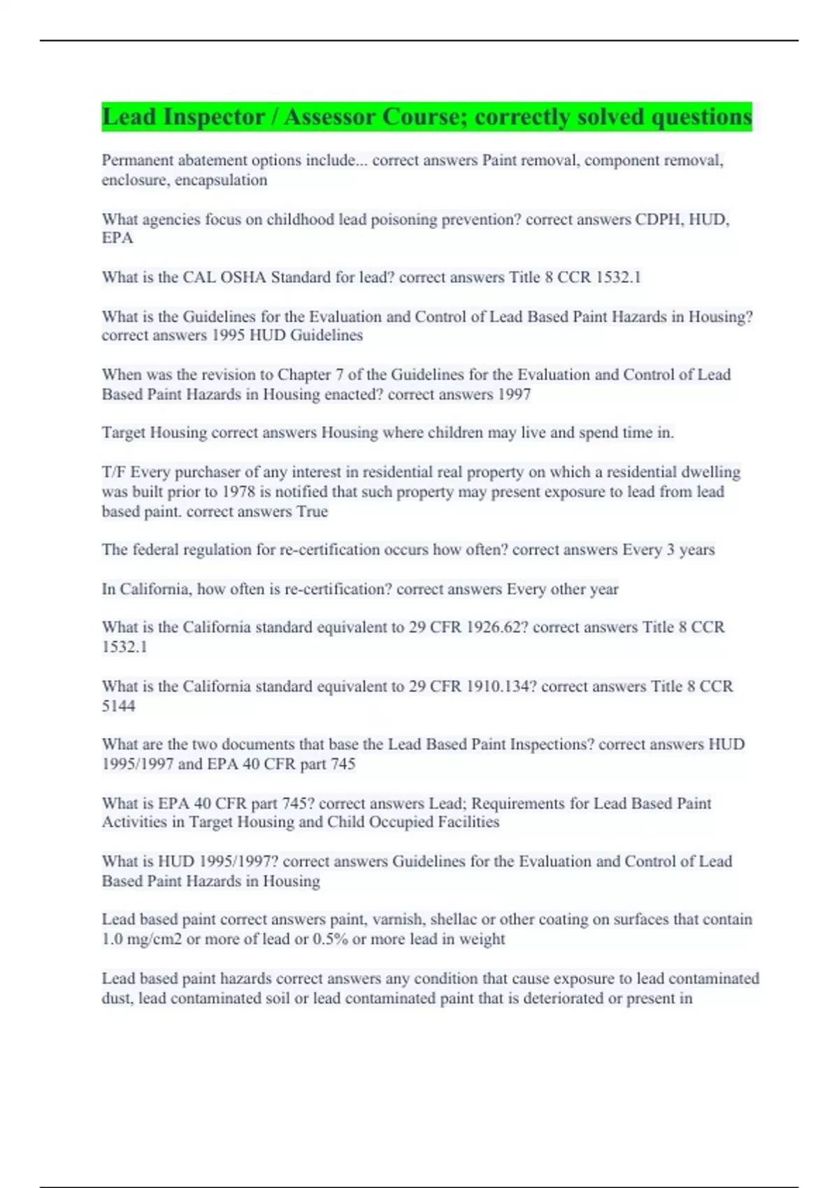 Permanent abatement options include... correct answers Paint removal, component removal, enclosure, encapsulation What agencies focus on childhood lead poisoning prevention? correct answers CDPH, HUD, EPA What is the CAL OSHA Standard for lead? correct answers Title 8 CCR 1532.1 What is the Guidelines for the Evaluation and Control of Lead Based Paint Hazards in Housing? correct answers 1995 HUD Guidelines When was the revision to Chapter 7 of the Guidelines for the Evaluation and Control of Lead Based Paint Hazards in Housing enacted? correct answers 1997 Target Housing correct answers Housing where children may live and spend time in. T/F Every purchaser of any interest in residential real property on which a residential dwelling was built prior to 1978 is notified that such property may present exposure to lead from lead based paint. correct answers True The federal regulation for re-certification occurs how often? correct answers Every 3 years In California, how often is re-certification? correct answers Every other year What is the California standard equivalent to 29 CFR 1926.62? correct answers Title 8 CCR 1532.1 What is the California standard equivalent to 29 CFR 1910.134? correct answers Title 8 CCR 5144 What are the two documents that base the Lead Based Paint Inspections? correct answers HUD 1995/1997 and EPA 40 CFR part 745 What is EPA 40 CFR part 745? correct answers Lead; Requirements for Lead Based Paint Activities in Target Housing and Child Occupied Facilities What is HUD 1995/1997? correct answers Guidelines for the Evaluation and Control of Lead Based Paint Hazards in Housing Lead based paint correct answers paint, varnish, shellac or other coating on surfaces that contain 1.0 mg/cm2 or more of lead or 0.5% or more lead in weight Lead based paint hazards correct answers any condition that cause exposure to lead contaminated dust, lead contaminated soil or lead contaminated paint that is deteriorated or present in