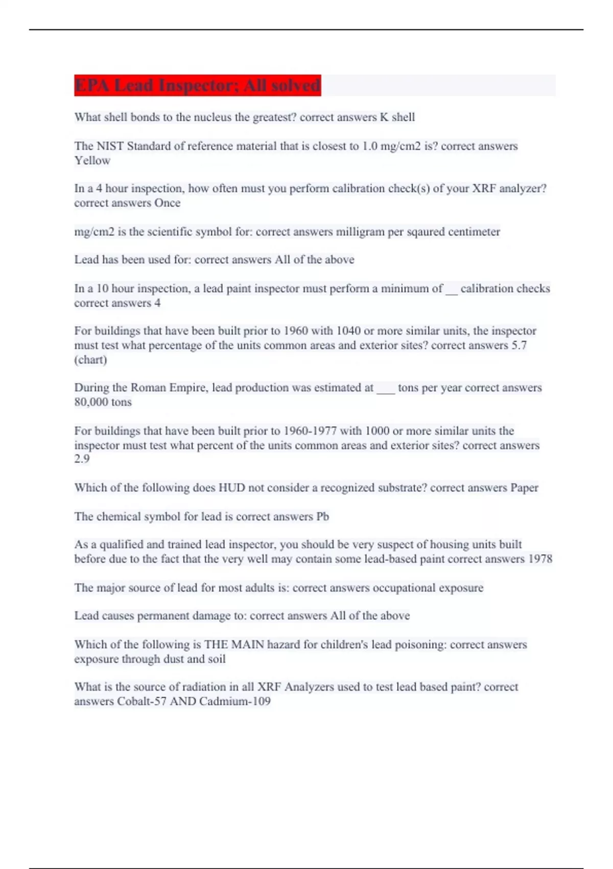 What shell bonds to the nucleus the greatest? correct answers K shell The NIST Standard of reference material that is closest to 1.0 mg/cm2 is? correct answers Yellow In a 4 hour inspection, how often must you perform calibration check(s) of your XRF analyzer? correct answers Once mg/cm2 is the scientific symbol for: correct answers milligram per sqaured centimeter Lead has been used for: correct answers All of the above In a 10 hour inspection, a lead paint inspector must perform a minimum of __ calibration checks correct answers 4 For buildings that have been built prior to 1960 with 1040 or more similar units, the inspector must test what percentage of the units common areas and exterior sites? correct answers 5.7 (chart) During the Roman Empire, lead production was estimated at ___ tons per year correct answers 80,000 tons For buildings that have been built prior to with 1000 or more similar units the inspector must test what percent of the units common areas and exterior sites? correct answers 2.9 Which of the following does HUD not consider a recognized substrate? correct answers Paper The chemical symbol for lead is correct answers Pb As a qualified and trained lead inspector, you should be very suspect of housing units built before due to the fact that the very well may contain some lead-based paint correct answers 1978 The major source of lead for most adults is: correct answers occupational exposure Lead causes permanent damage to: correct answers All of the above Which of the following is THE MAIN hazard for children's lead poisoning: correct answers exposure through dust and soil What is the source of radiation in all XRF Analyzers used to test lead based paint? correct answers Cobalt-57 AND Cadmium-109