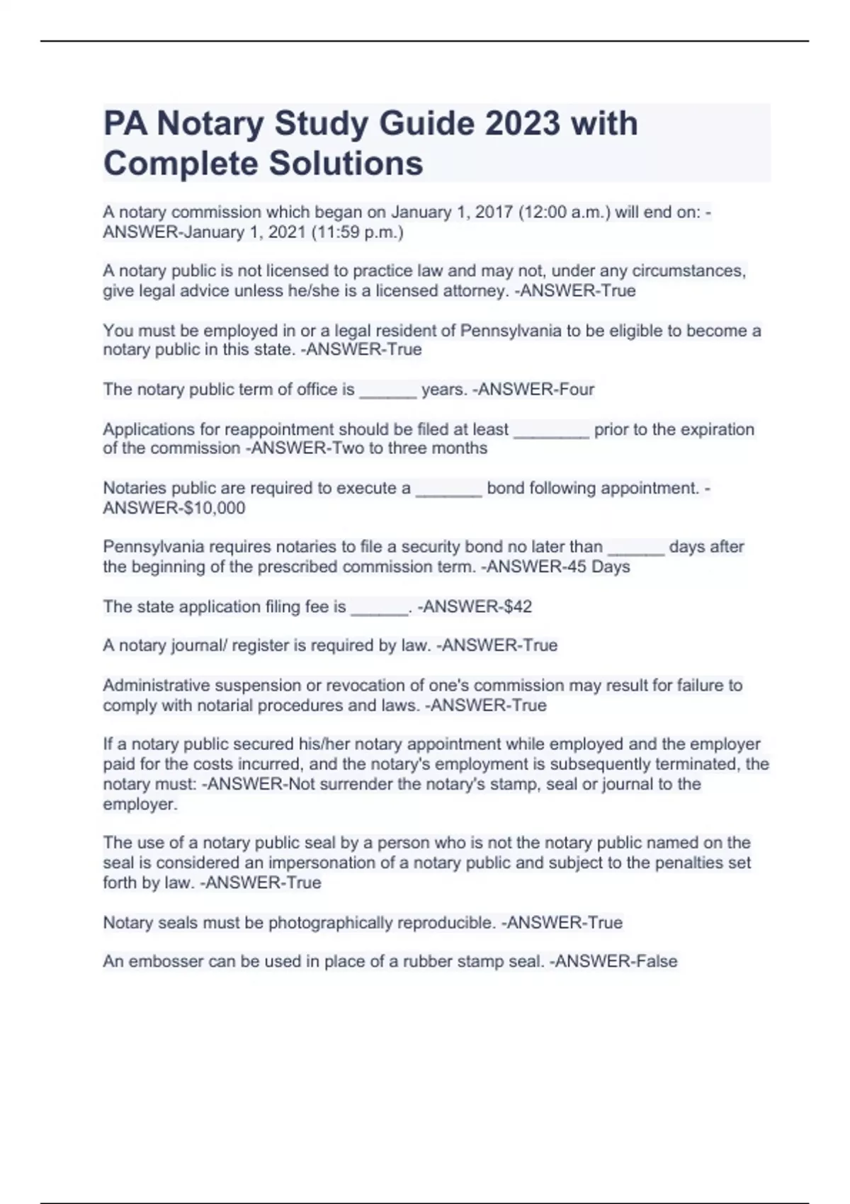 PA Notary Study Guide 2023 with Complete Solutions PA Notary Study Guide 2023 with Complete Solutions PA Notary Study Guide 2023 with Complete Solutions A notary commission which began on January 1, 2017 (12:00 a.m.) will end on: -ANSWER-January 1, 2021 (11:59 p.m.) A notary public is not licensed to practice law and may not, under any circumstances, give legal advice unless he/she is a licensed attorney. -ANSWER-True You must be employed in or a legal resident of Pennsylvania to be eligible to become a notary public in this state. -ANSWER-True The notary public term of office is ______ years. -ANSWER-Four Applications for reappointment should be filed at least ________ prior to the expiration of the commission -ANSWER-Two to three months Notaries public are required to execute a _______ bond following appointment. -ANSWER-$10,000 Pennsylvania requires notaries to file a security bond no later than ______ days after the beginning of the prescribed commission term. -ANSWER-45 Days The state application filing fee is ______. -ANSWER-$42 A notary journal/ register is required by law. -ANSWER-True