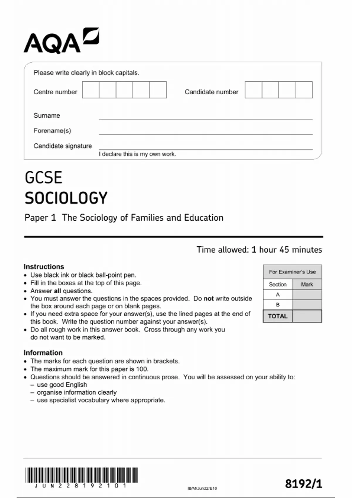 this is AQA GCSE SOCIOLOGY PAPER 1 2022 [8192/1] click for instant download