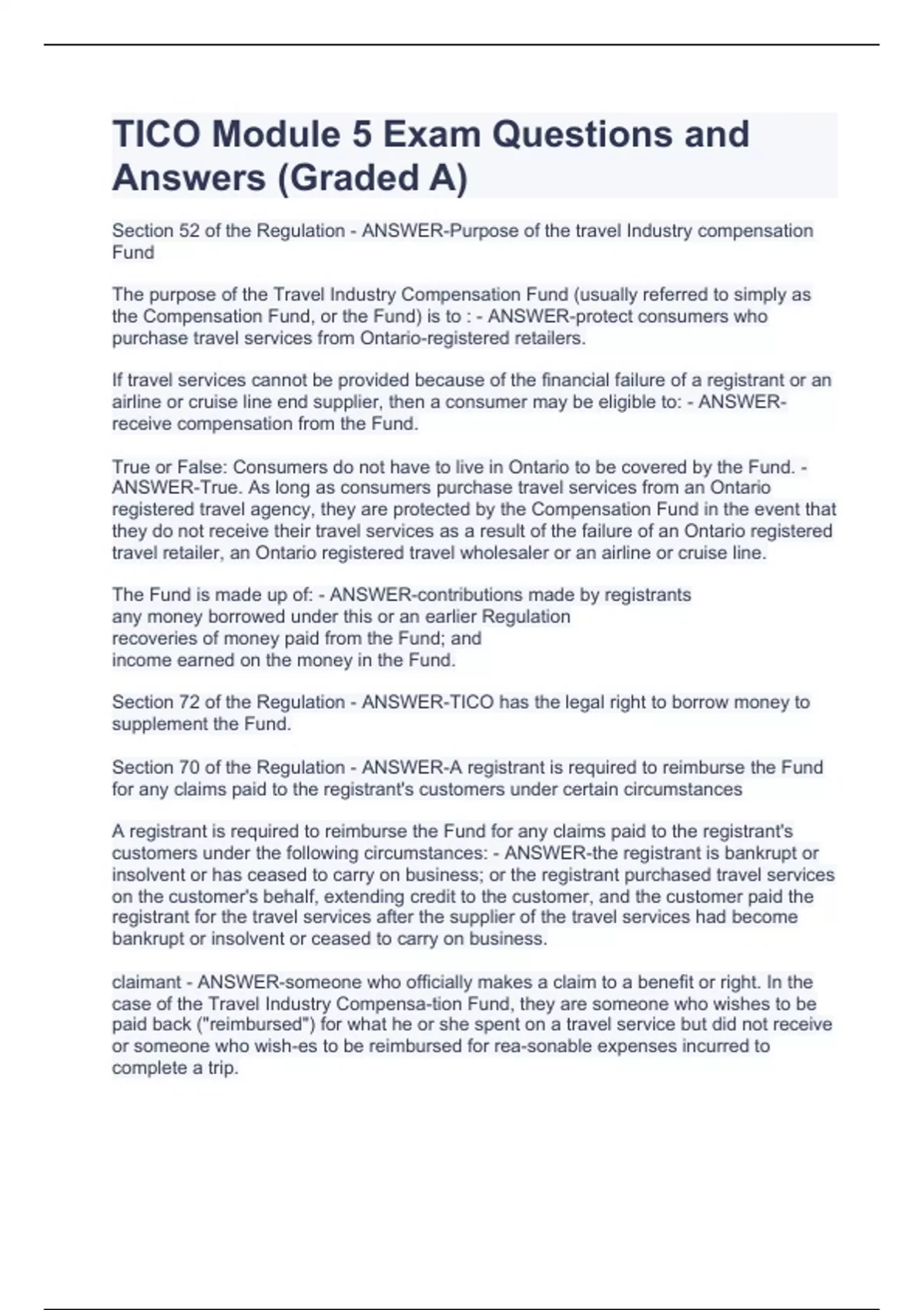 TICO Module 5 Exam Questions and Answers (Graded A) TICO Module 5 Exam Questions and Answers (Graded A) TICO Module 5 Exam Questions and Answers (Graded A) Section 52 of the Regulation - ANSWER-Purpose of the travel Industry compensation Fund The purpose of the Travel Industry Compensation Fund (usually referred to simply as the Compensation Fund, or the Fund) is to : - ANSWER-protect consumers who purchase travel services from Ontario-registered retailers. If travel services cannot be provided because of the financial failure of a registrant or an airline or cruise line end supplier, then a consumer may be eligible to: - ANSWER-receive compensation from the Fund. True or False: Consumers do not have to live in Ontario to be covered by the Fund. - ANSWER-True. As long as consumers purchase travel services from an Ontario registered travel agency, they are protected by the Compensation Fund in the event that they do not receive their travel services as a result of the failure of an Ontario registered travel retailer, an Ontario registered travel wholesaler or an airline or cruise line. The Fund is made up of: - ANSWER-contributions made by registrants any money borrowed under this or an earlier Regulation recoveries of money paid from the Fund; and income earned on the money in the Fund. Section 72 of the Regulation - ANSWER-TICO has the legal right to borrow money to supplement the Fund. Section 70 of the Regulation - ANSWER-A registrant is required to reimburse the Fund for any claims paid to the registrant's customers under certain circumstances A registrant is required to reimburse the Fund for any claims paid to the registrant's customers under the following circumstances: - ANSWER-the registrant is bankrupt or insolvent or has ceased to carry on business; or the registrant purchased travel services on the customer's behalf, extending credit to the customer, and the customer paid the registrant for the travel services after the supplier of the travel services had become bankrupt or insolvent or ceased to carry on business. claimant - ANSWER-someone who officially makes a claim to a benefit or right. In the case of the Travel Industry Compensa-tion Fund, they are someone who wishes to be paid back ("reimbursed") for what he or she spent on a travel service but did not receive or someone who wish-es to be reimbursed for rea-sonable expenses incurred to complete a trip. A travel agent or travel wholesaler must contribute to the: - ANSWER-Travel Industry Compensation Fund. Contributions to the Fund must be made : - ANSWER-twice a year (at a six-month interval), with each payment based on the company's gross sales in Ontario. When registrants make payments to the Fund, each payment must be accompanied by : - ANSWER-a completed return that shows the registrant's sales in Ontario for the preceding fiscal half-year and the amount owing to TICO. Registrant returns must be: - ANSWER-certified for accuracy by the registrant or an authorized officer or partner of the registrant.