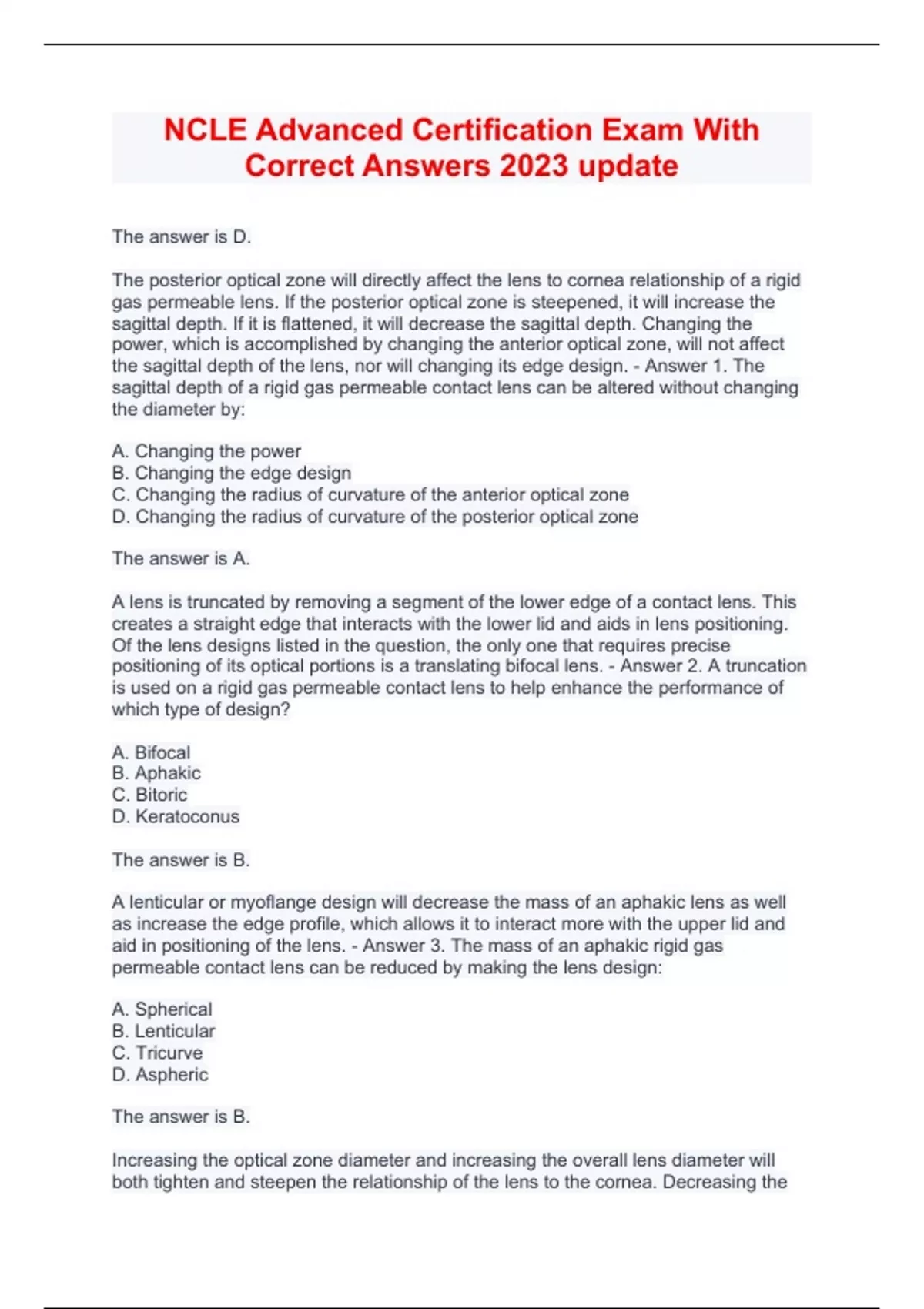ncle advanced certification exam with correct answers 2023 update the answer is d the posterior optical zone will directly affect the lens to cornea relationship of a rigid gas permeable lens if