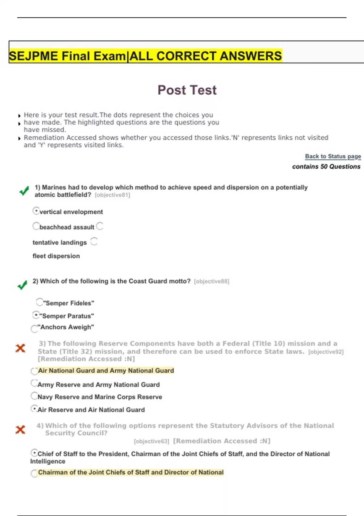 SEJPME Final Exam|ALL CORRECT ANSWERS Post Test Here is your test result.The dots represent the choices you have made. The highlighted questions are the questions you have missed. Remediation Accessed shows whether you accessed those links.'N' represents links not visited and 'Y' represents visited links. Back to Status page contains 50 Questions 1) Marines had to develop which method to achieve speed and dispersion on a potentially atomic battlefield? [objective81] vertical envelopment beachhead assault tentative landings fleet dispersion 2) Which of the following is the Coast Guard motto? [objective88] "Semper Fideles" "Semper Paratus" "Anchors Aweigh" 3) The following Reserve Components have both a Federal (Title 10) mission and a State (Title 32) mission, and therefore can be used to enforce State laws. [objective92] [Remediation Accessed :N] Air National Guard and Army National Guard Army Reserve and Army National Guard Navy Reserve and Marine Corps Reserve Air Reserve and Air National Guard 4) Which of the following options represent the Statutory Advisors of the National Security Council? [objective63] [Remediation Accessed :N] Chief of Staff to the President, Chairman of the Joint Chiefs of Staff, and the Director of National Intelligence Chairman of the Joint Chiefs of Staff and Director of National Intelligence President, Vice President, Secretary of State, and Secretary of Defense Secretary of the Treasury and Secretary of Homeland Security 5) During the early 1990s, what event shifted the focus of the Army's activities toward the stopping old rivalries and conflicts? [objective79]