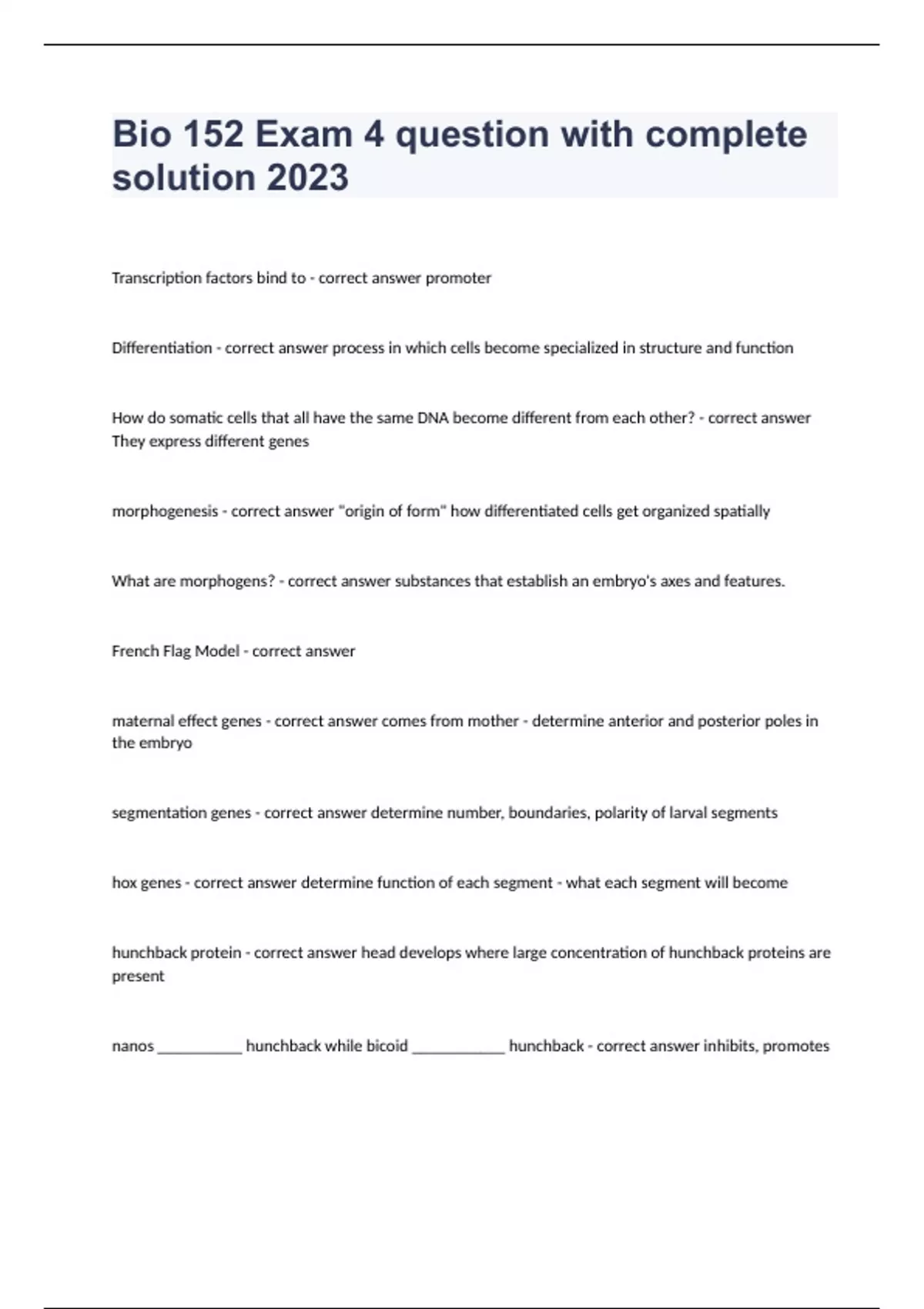 Bio 152 Exam 4 question with complete solution 2023Transcription factors bind to - correct answer promoter Differentiation - correct answer process in which cells become specialized in structure and function How do somatic cells that all have the same DNA become different from each other? - correct answer They express different genes morphogenesis - correct answer "origin of form" how differentiated cells get organized spatially What are morphogens? - correct answer substances that establish an embryo's axes and features. French Flag Model - correct answer maternal effect genes - correct answer comes from mother - determine anterior and posterior poles in the embryo segmentation genes - correct answer determine number, boundaries, polarity of larval segments hox genes - correct answer determine function of each segment - what each segment will become hunchback protein - correct answer head develops where large concentration of hunchback proteins are present nanos __________ hunchback while bicoid ___________ hunchback - correct answer inhibits, promotes Growth - correct answer increase in body size by cell division and expansion *Direct Development* When lots of nourishing yolk is present, embryos develop into _____ - correct answer a miniature adult *Indirect Development* When little yolk is present, young develop into ______ - correct answer larval stages that can feed Allometric growth - correct answer Proportioning that gives a body a specific form. (i.e. human head grows slower than human legs) isometric growth - correct answer entire body grows at same rates 4 Sequential Stages of Development - correct answer 1. Fertilization 2. Cleavage 3. Gastrulation 4. Organogenesis direct product of fertilization - correct answer zygote (n+n = 2n)