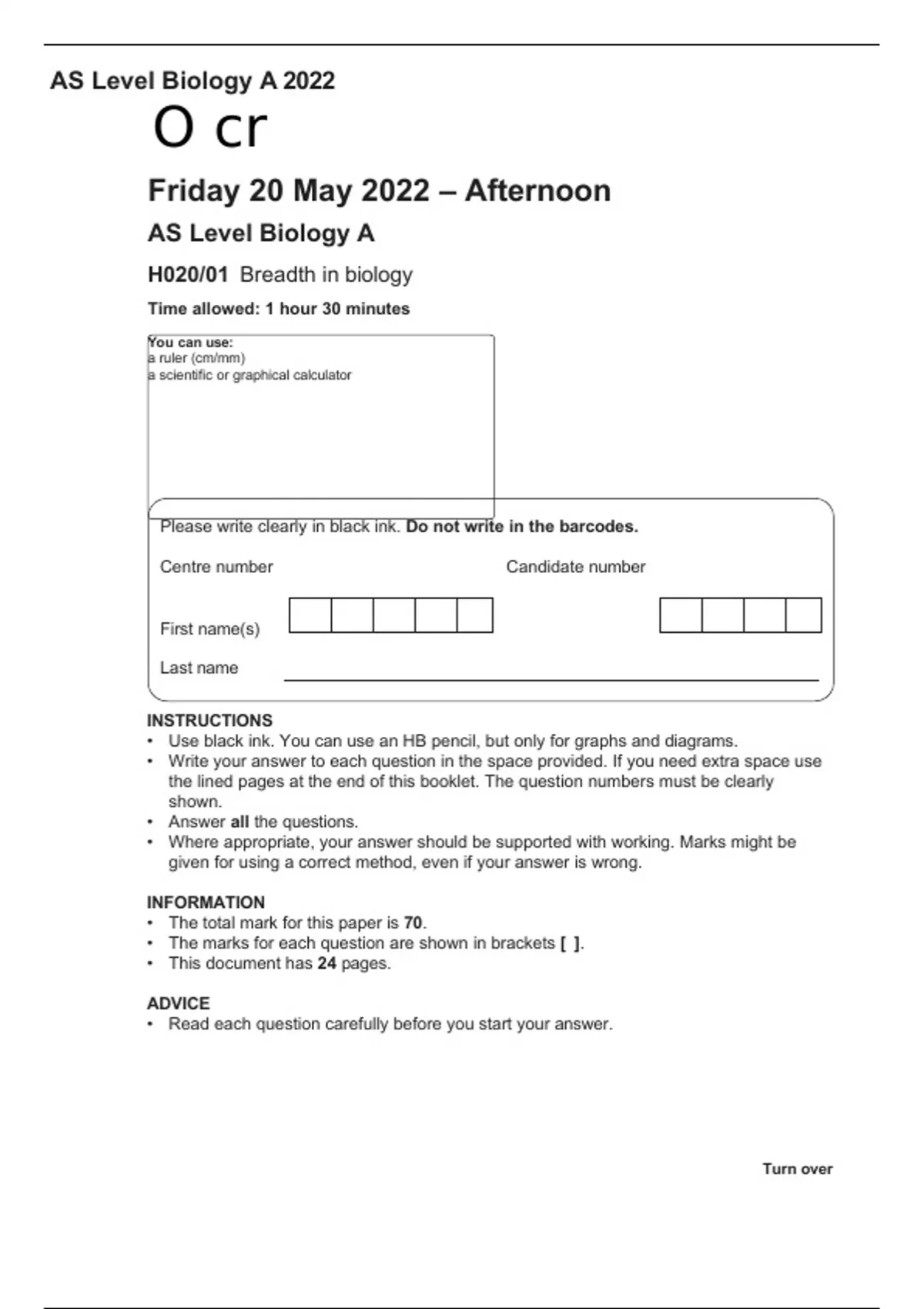 OCR AS Level Biology A H020/01 : Breadth in Biology 2022 QP