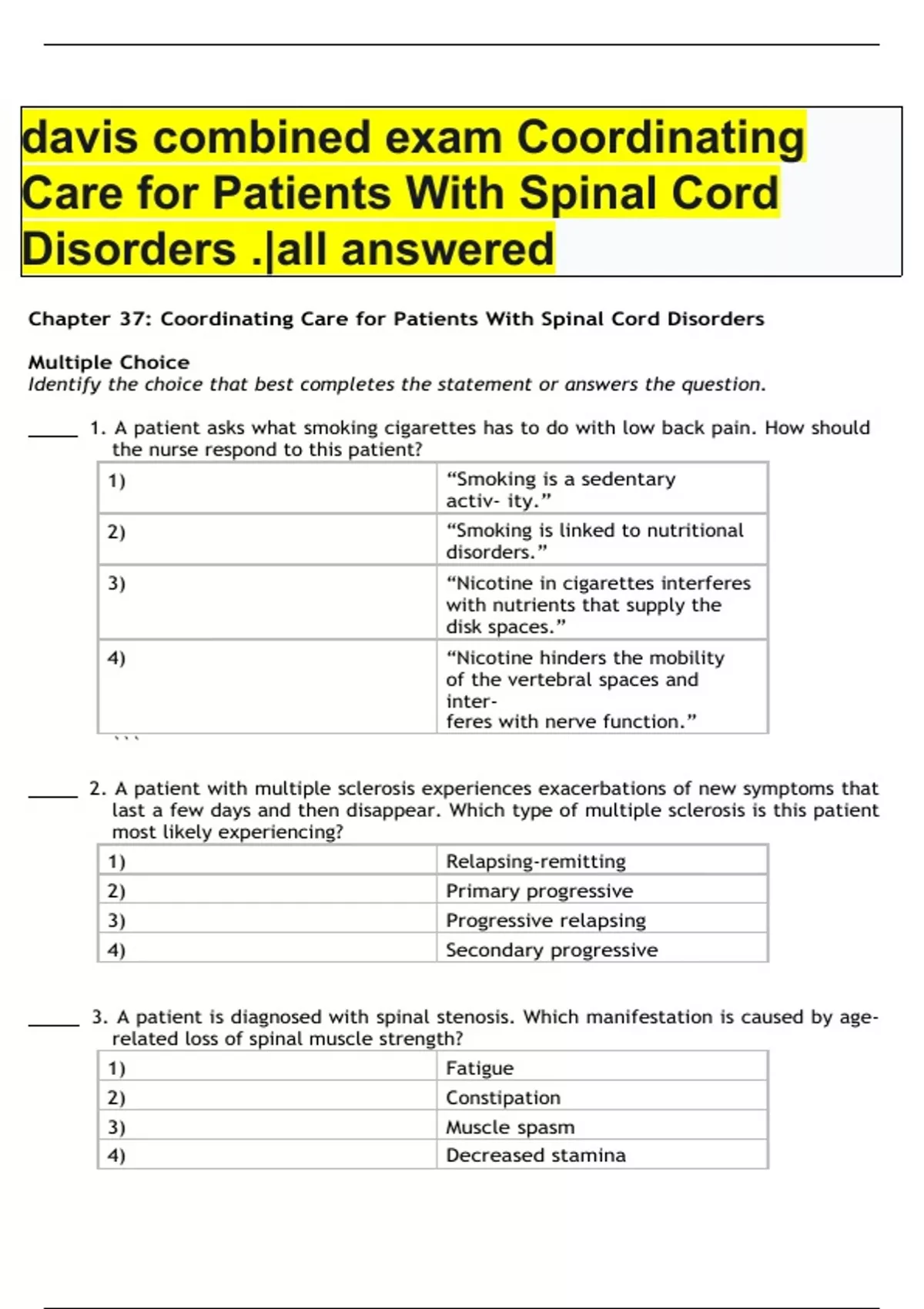 ATLS® Written Pretest #1 10th Edition Disclaimer: Note: It is understood that medical practices vary with institutional policies and individual preferences. This test is designed in conjunction with the material presented in the 10th edition of the ATLS® Course. Please answer the questions accordingly. 1-1. A 22-year-old man is hypotensive and tachycardic after a shotgun wound to the left shoulder. His blood pressure is initially 80/40 mm Hg. After initial fluid resuscitation, his blood pressure increases to 122/84 mm Hg. His heart rate is now 100 beats per minute and his respiratory rate is 28 breaths per minute. A tube thoracostomy is performed for decreased left chest breath sounds with the return of a small amount of blood and no air leak. After chest tube insertion, the most appropriate next step is: a. reexamine the chest. b. perform an aortogram. c. obtain a computed tomography (CT) scan of the chest. d. obtain arterial blood gas analyses. e. perform transesophageal echocardiography. 1-2. A construction worker falls two stories from a building and sustains bilateral calcaneal fractures. In the emergency department (ED), he is alert, his vital signs are normal, and he is complaining of severe pain in both heels and his lower back. Lower extremity pulses are strong and there is no other deformity. The suspected diagnosis is most likely to be confirmed by: a. angiography. b. compartment pressures. c. retrograde urethrogram. d. Doppler ultrasound studies. e. complete spine x-ray series. 1-3. Which of the following is true regarding the initial resuscitation of a trauma patient? a. A patient with a torso gunshot wound and hypotension should receive crystalloid fluid resuscitation until the blood pressure is normal. b. Evidence of improved perfusion after fluid resuscitation could include improvement in Glasgow Coma Scale (GCS) score on reevaluation. c. Massive transfusion is defined as transfusion of more than 10 units of packed red blood cells and plasma within 24 hours. d. When tranexamic acid is administered by prehospital providers, a second dose is required within 24 hours. e. Fluid resuscitation is far more important than bleeding control in trauma patients. 1-4. In managing a patient with a severe traumatic brain injury, the most important initial step is to: a. secure the airway. b. obtain a c-spine film. c. support the circulation. d. control scalp hemorrhage. e. determine the GCS score. 1-5. A previously healthy, 70-kg (154-pound) man suffers an estimated acute blood loss of 2 liters. Which statement applies to this patient? a. His pulse pressure will be widened. b. His urinary output will be at the lower limits of normal. c. He will have tachycardia but no change in his systolic blood pressure. d. An arterial blood gas would demonstrate a base deficit between –6 and –10 mEq/L. e. His systolic blood pressure will be maintained with an elevated diastolic pressure.