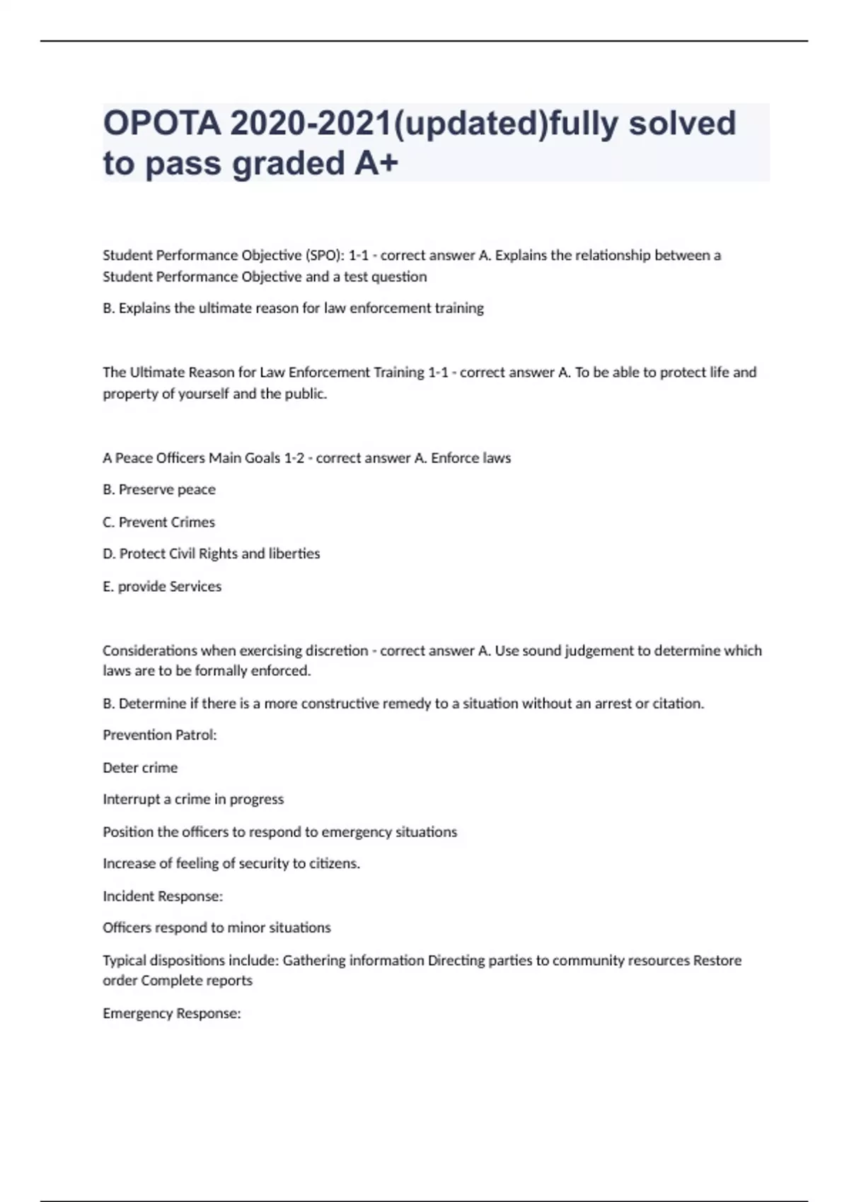 OPOTA (updated)fully solved to pass graded A+Student Performance Objective (SPO): 1-1 - correct answer A. Explains the relationship between a Student Performance Objective and a test question B. Explains the ultimate reason for law enforcement training The Ultimate Reason for Law Enforcement Training 1-1 - correct answer A. To be able to protect life and property of yourself and the public. A Peace Officers Main Goals 1-2 - correct answer A. Enforce laws B. Preserve peace C. Prevent Crimes D. Protect Civil Rights and liberties E. provide Services Considerations when exercising discretion - correct answer A. Use sound judgement to determine which laws are to be formally enforced. B. Determine if there is a more constructive remedy to a situation without an arrest or citation. Prevention Patrol: Deter crime Interrupt a crime in progress Position the officers to respond to emergency situations Increase of feeling of security to citizens. Incident Response: Officers respond to minor situations Typical dispositions include: Gathering information Directing parties to community resources Restore order Complete reports Emergency Response: Takes precedence over all other calls Less common than routine incident calls Includes incidents. Criminal Investigation: Process of discovering, collecting, preparing, identifying and presenting evidence to determine what happened and who is responsible. Investigations carried out by detectives Responding officer secures and protects the scene Detective should be able to pick up where the responding officer left off. Factors Necessary for the commission of a Crime - correct answer A. Desire (Most difficult to change) The motivation behind the criminal behavior. B. Victim the potential target criminals prefer an easy target that is unaware of his/her surroundings or lacking proper security precautions. C. Opportunity (easiest to change) Removing opportunity for crime with proper security measures applied to the victim's environment D.O.V. Crime Prevention is About: A. Attitude B. Modifying Behavior 4 "D's" of Crime Prevention: Deny Delay Detect Deter Core Concept of Community Policing - correct answer A. A partnership between the police and the community B. Crime prevention C. Organizational change of the agency D. A problem solving approach to the police role that is proactive "SARA" Model: A. Scanning