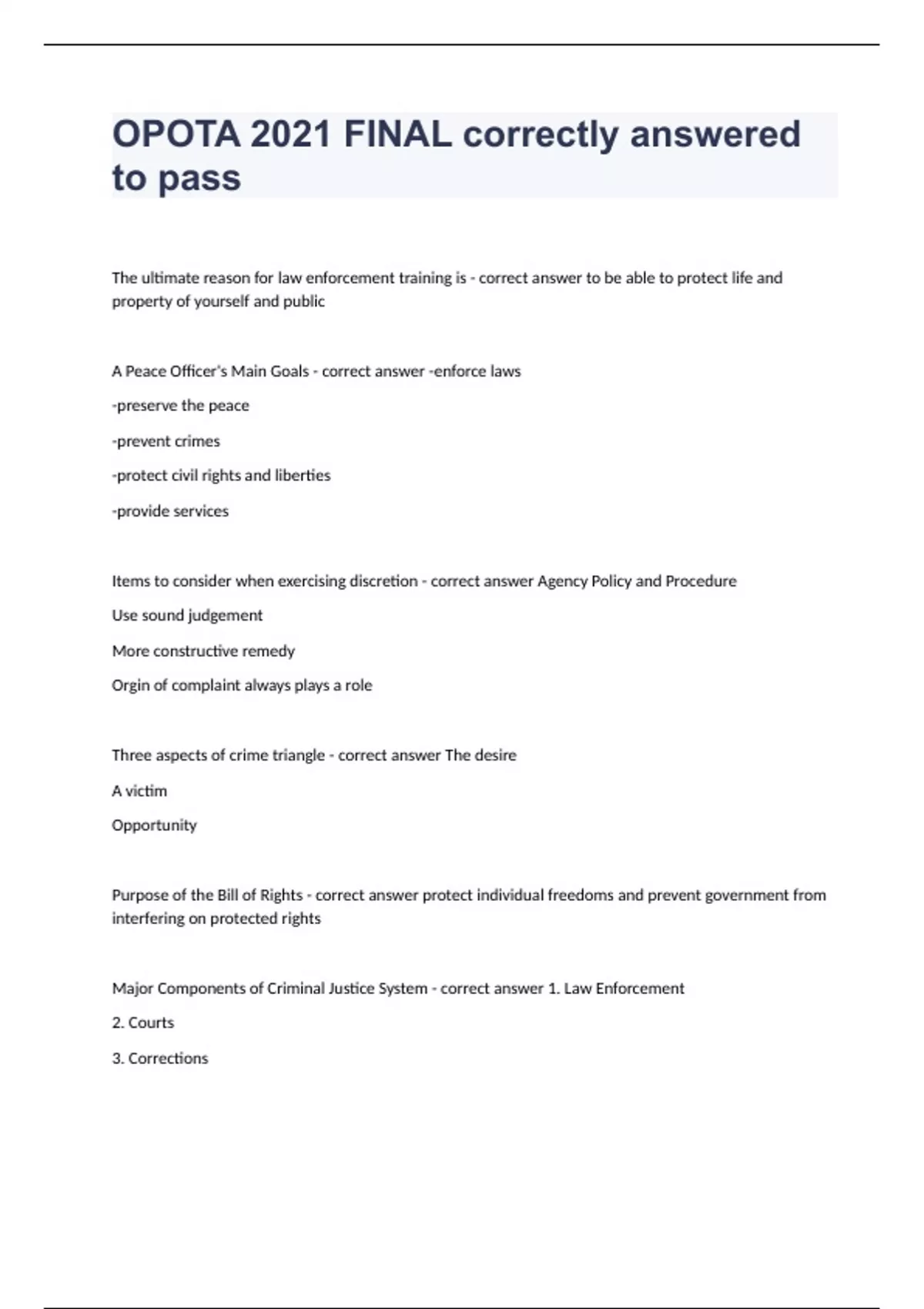 OPOTA 2021 FINAL correctly answered to pass The ultimate reason for law enforcement training is - correct answer to be able to protect life and property of yourself and public A Peace Officer's Main Goals - correct answer -enforce laws -preserve the peace -prevent crimes -protect civil rights and liberties -provide services Items to consider when exercising discretion - correct answer Agency Policy and Procedure Use sound judgement More constructive remedy Orgin of complaint always plays a role Three aspects of crime triangle - correct answer The desire A victim Opportunity Purpose of the Bill of Rights - correct answer protect individual freedoms and prevent government from interfering on protected rights Major Components of Criminal Justice System - correct answer 1. Law Enforcement 2. Courts 3. Corrections Goals of Sentencing - correct answer Punish the offender and in many cases, rehabilitate the offender Protect society Restore the victim as much as possible When permissible for citizens to film police - correct answer At least one party consents and does not interfere with officers lawful actions. Types of Racism - correct answer -Individual -Interpersonal -Institutional -Structural Types of Bias - correct answer Explicit Implicit Two modes of thinking - correct answer Automatic (System 1) More deliberative (System 2) Two-pronged Approach to Procedural Justice - correct answer Person-based approach - emphasizes the importance of face-to-face interactions between an officer and a citizen Community-based model - ultimate goal is to achieve police legitimacy throughout entire society The Community Bank Account Concept as it Relates to Procedural Justice - correct answer Every interaction is either positive deposit or negative withdraw The four core Principles/Pillars of Procedural Justice - correct answer 1 Give others a voice 2Neutrality in a decision 3 Respectful Treatment