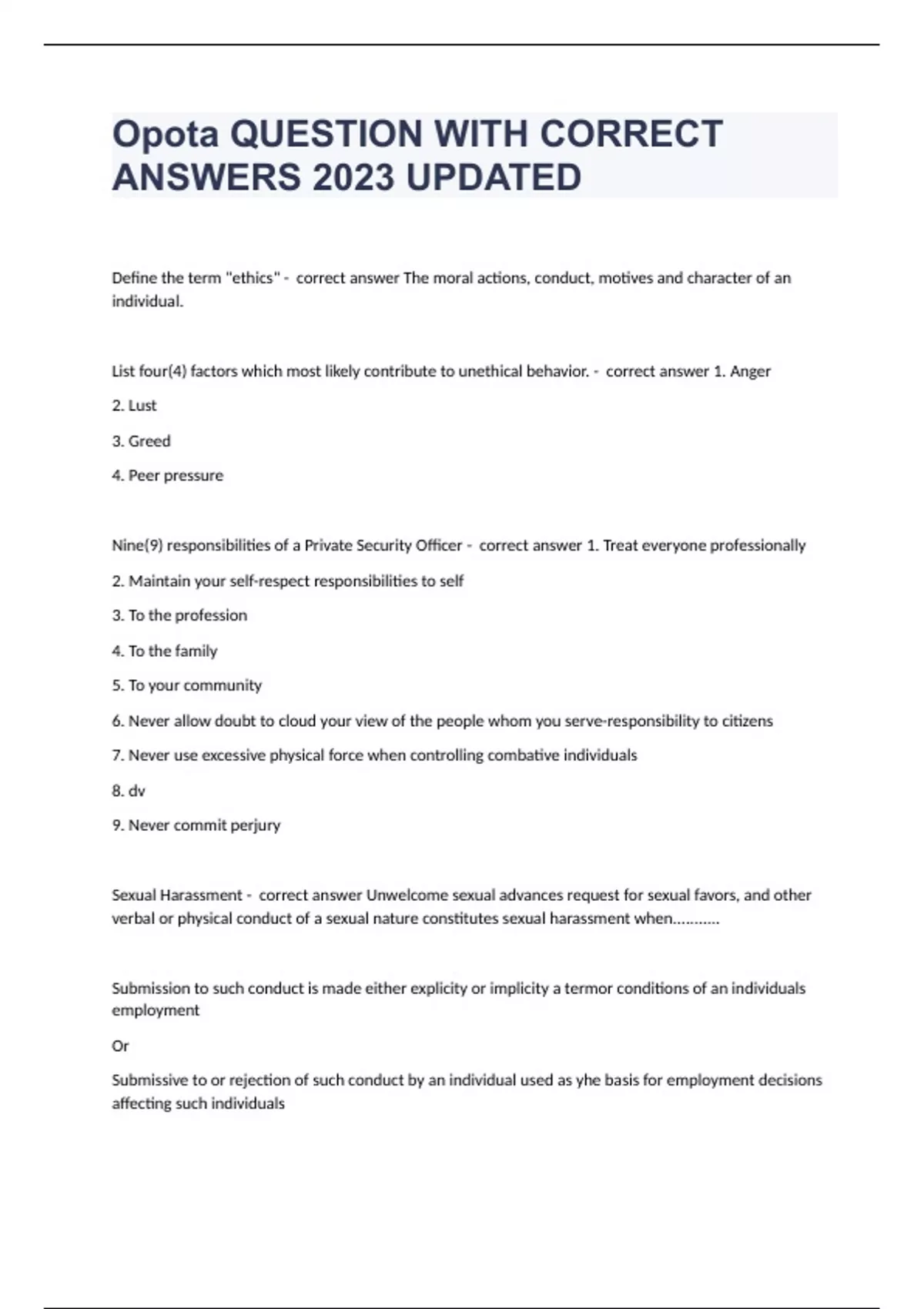 Opota QUESTION WITH CORRECT ANSWERS 2023 UPDATEDDefine the term "ethics" - correct answer The moral actions, conduct, motives and character of an individual. List four(4) factors which most likely contribute to unethical behavior. - correct answer 1. Anger 2. Lust 3. Greed 4. Peer pressure Nine(9) responsibilities of a Private Security Officer - correct answer 1. Treat everyone professionally 2. Maintain your self-respect responsibilities to self 3. To the profession 4. To the family 5. To your community 6. Never allow doubt to cloud your view of the people whom you serve-responsibility to citizens 7. Never use excessive physical force when controlling combative individuals 8. dv 9. Never commit perjury Sexual Harassment - correct answer Unwelcome sexual advances request for sexual favors, and other verbal or physical conduct of a sexual nature constitutes sexual harassment when........... Submission to such conduct is made either explicity or implicity a termor conditions of an individuals employment Or Submissive to or rejection of such conduct by an individual used as yhe basis for employment decisions affecting such individuals Or Such conduct has the purpose or effect of unreasonably interfering with an individuals work performance or creating an intimidating hostile or offensive work environment Code of Ethics - correct answer The purpose of any code of ethics is to identify expected behavior Define the word "misdemeanor" - correct answer Any offense not specifically classified is a misdemeanor if imprisonment for not more than six months Define the word "felony - correct answer Any offense not specifically classified a felony if imprisonment for more than six months List the four culpable mental states. - correct answer 1. Purposely (specific intentions) willing deliberately. 2. Knowingly (aware) his/her conduct will probably cause a certain result 3. Recklessly - with needless indifference. 4. Negligently - lapse of due care' 5. State Five Reasons for Private Security Training - correct answer 1. To acquire knowledge and skills 2. To prepare for proper job performance 3. To improve safety survival during critical events 4. To standardize the procedures within the field of private security 5. Build confidence with new found knowledge and skills Explain the difference between a Student Performance Objective and a Test question - correct answer 1. A test question must respond directly to an SPO and SPO may be the basis of a test question Definition of Private Security - correct answer 1. Those self employed individuals and privately funded business entities and organizations providing security related services to specific clientele