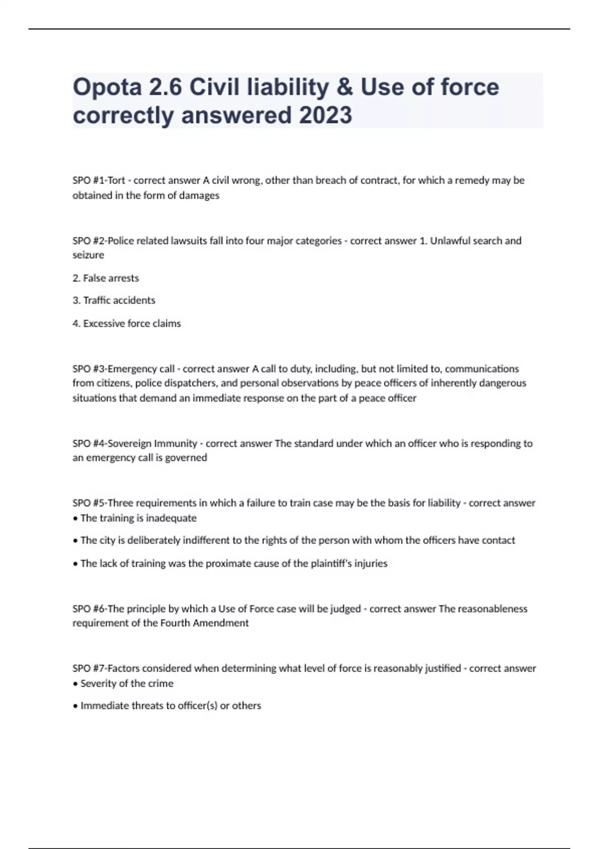 Opota 2.6 Civil liability & Use of force correctly answered 2023 SPO #1-Tort - correct answer A civil wrong, other than breach of contract, for which a remedy may be obtained in the form of damages SPO #2-Police related lawsuits fall into four major categories - correct answer 1. Unlawful search and seizure 2. False arrests 3. Traffic accidents 4. Excessive force claims SPO #3-Emergency call - correct answer A call to duty, including, but not limited to, communications from citizens, police dispatchers, and personal observations by peace officers of inherently dangerous situations that demand an immediate response on the part of a peace officer SPO #4-Sovereign Immunity - correct answer The standard under which an officer who is responding to an emergency call is governed SPO #5-Three requirements in which a failure to train case may be the basis for liability - correct answer • The training is inadequate • The city is deliberately indifferent to the rights of the person with whom the officers have contact • The lack of training was the proximate cause of the plaintiff's injuries SPO #6-The principle by which a Use of Force case will be judged - correct answer The reasonableness requirement of the Fourth Amendment SPO #7-Factors considered when determining what level of force is reasonably justified - correct answer • Severity of the crime • Immediate threats to officer(s) or others