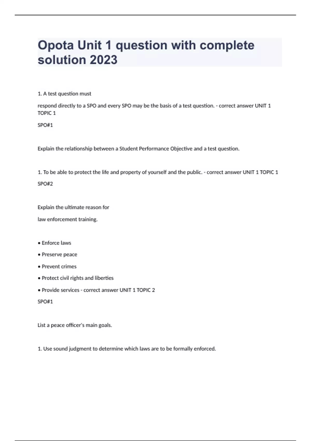 Opota Unit 1 question with complete solution 2023 1. A test question must respond directly to a SPO and every SPO may be the basis of a test question. - correct answer UNIT 1 TOPIC 1 SPO#1 Explain the relationship between a Student Performance Objective and a test question. 1. To be able to protect the life and property of yourself and the public. - correct answer UNIT 1 TOPIC 1 SPO#2 Explain the ultimate reason for law enforcement training. • Enforce laws • Preserve peace • Prevent crimes • Protect civil rights and liberties • Provide services - correct answer UNIT 1 TOPIC 2 SPO#1 List a peace officer's main goals. 1. Use sound judgment to determine which laws are to be formally enforced. 2. Determine if there is a more constructive remedy to a situation without an arrest or citation (e.g. referring a homeless person to a shelter rather than a trespassing arrest.) - correct answer UNIT 1 TOPIC 2 SPO#2 Explain items to consider when exercising discretion 1. Desire The motivation behind criminal behavior (e.g., financial gain, power, revenge, fear, and narcotics usage) 2. Victim The potential target 3. Opportunity Removing opportunity for a crime with proper security measures applied to the victim's environment (e.g., locking doors/windows, - correct answer UNIT 1 TOPIC 2 SPO#3 Explain the factors necessary for the commission of a crime (i.e., the Crime Triangle) • A partnership between the police and the community • Crime prevention • Organizational change of the agency • A problem solving approach to the police role that is proactive - correct answer UNIT 1 TOPIC 2 SPO#4 State the core concepts of Community Policing. 1. Behavior An officers behavior is often scrutinized by the