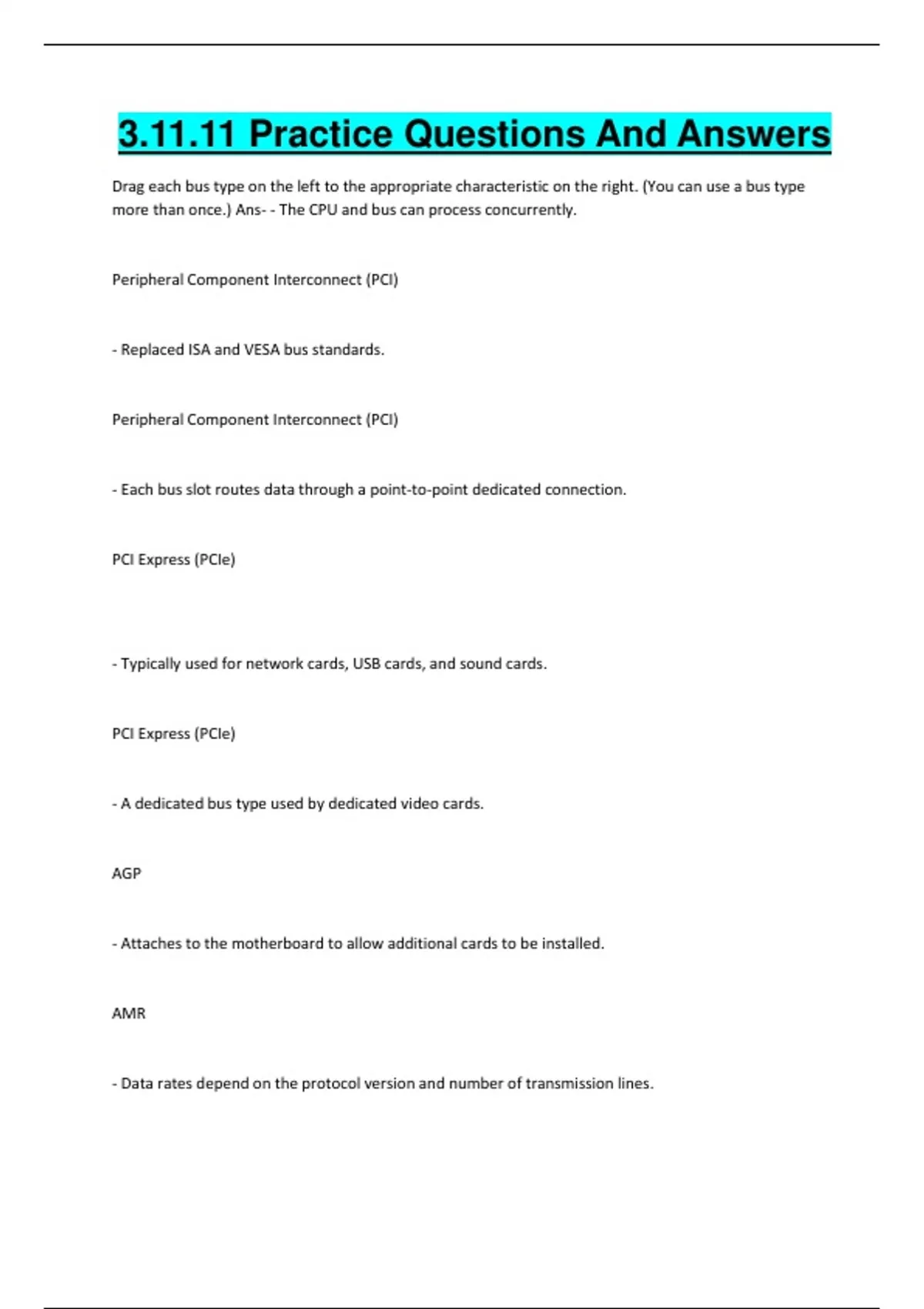 3.11.11 Practice Questions And Answers Drag each bus type on the left to the appropriate characteristic on the right. (You can use a bus type more than once.) Ans- - The CPU and bus can process concurrently. Peripheral Component Interconnect (PCI) - Replaced ISA and VESA bus standards. Peripheral Component Interconnect (PCI) - Each bus slot routes data through a point-to-point dedicated connection. PCI Express (PCIe) - Typically used for network cards, USB cards, and sound cards. PCI Express (PCIe) - A dedicated bus type used by dedicated video cards. AGP - Attaches to the motherboard to allow additional cards to be installed. AMR - Data rates depend on the protocol version and number of transmission lines. PCI Express (PCIe) For a special project, you have been asked to recommend the lowest profile desktop computers available. You are attempting to put together the specifications for these machines. Which of the following types of cards are attached to the motherboard and allow additional cards to be installed? Ans- Riser A technician wants to connect a computer to a high-definition television (HDTV). The technician has attached an HDMI cable from the video card to the television. However, the video card is only sending a video signal over the cable. The technician decides to use the audio pass-through technique to deliver audio to the television. An audio output cable is connected to the video card and television. Which of the following options was used for the audio pass-through? Ans- HDMI output You need to connect a monitor that provides an HDMI port and a VGA port to a video adapter in a PC system that uses a DVI-D connector. Which of the following options provides the BEST display quality at the lowest cost? Ans- Use an adapter to connect the monitor HDMI port to the DVI-D connector on the PC. You have a friend who is offering to sell the monitor and video card from his gaming system along with several PC games. The games have fast-moving graphics, and you want to be able to play them on your own home system. The monitor he is selling is an LCD TN with a 144-Hz refresh rate. The video card he is selling supports a max refresh rate of 144 Hz. You're sure you want to buy the games, but you have a couple of other choices when it comes to the monitor and the video card. The monitor in your current system has a 60-Hz refresh rate. The video card has a max refresh rate of 75 Hz. This configuration has always worked fine for watching videos. You're also looking at new 60-Hz LCD IPS monitors and several high-end video cards with max refresh rates of up to 240 Hz. Which of the following will MOST likely allow you to play the games on your home system with the best gaming experience possible? Ans- Buy your friend's games, monitor, and video card. Swap out both your video card and monitor. A customer wants to add an additional video card to her computer so she can play the latest computer games. As a result, this system will now have a multi-GPU configuration. Which of the following statements are true when it comes to a multi-GPU configuration? (Select two.) Ans- - For the best performance, both video cards should be identical. - The motherboard should support either SLI or CrossFire. You are in the process of building a new computer. You would like to configure your computer to use SLI to improve performance while playing your favorite game. Which of the following will MOST likely be part of the configuration process? (Select three.) Ans- - Purchase two graphics cards with SLI and similar specifications. - Connect at least one monitor to the graphics card. - Purchase a motherboard with two (or more) PCIe x16 slots. You have just installed a new video card in a employee's Windows workstation. When you power the system on and load the OS, everything on the screen looks enlarged and pixelated. You try to change the resolution, but the only available option is 640x480. Which of the following BEST resolves this problem? Answer Ans- Download and install the latest driver from the video card manufacturer's website. You have just installed a video card in a PCIe expansion slot in your Windows workstation. You have made sure that the card is connected to the power supply using an 8-pin connector. You also have your monitor connected to the video card. However, when you boot your workstation, it displays a blank screen instead of the Windows system. Which of the following is the MOST likely cause of the problem? Ans- You have not configured the motherboard in BIOS/UEFI to utilize the new video card. You have installed two multi-GPU CrossFire video cards in your computer and linked them together using a bridge clip. You now need to connect your monitor to test the video card installation. Where should you connect your monitor on your computer? Ans- Primary (first) video car
