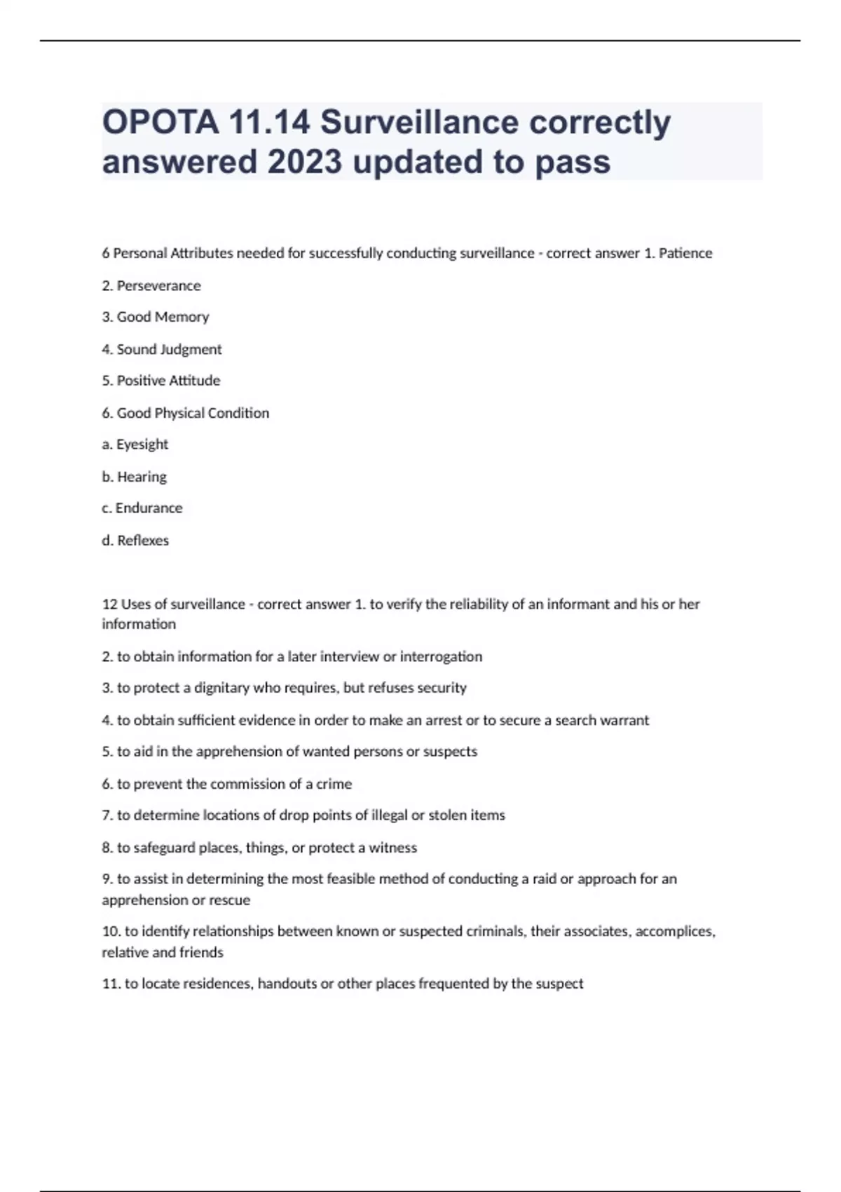 OPOTA 11.14 Surveillance correctly answered 2023 updated to pass6 Personal Attributes needed for successfully conducting surveillance - correct answer 1. Patience 2. Perseverance 3. Good Memory 4. Sound Judgment 5. Positive Attitude 6. Good Physical Condition a. Eyesight b. Hearing c. Endurance d. Reflexes 12 Uses of surveillance - correct answer 1. to verify the reliability of an informant and his or her information 2. to obtain information for a later interview or interrogation 3. to protect a dignitary who requires, but refuses security 4. to obtain sufficient evidence in order to make an arrest or to secure a search warrant 5. to aid in the apprehension of wanted persons or suspects 6. to prevent the commission of a crime 7. to determine locations of drop points of illegal or stolen items 8. to safeguard places, things, or protect a witness 9. to assist in determining the most feasible method of conducting a raid or approach for an apprehension or rescue 10. to identify relationships between known or suspected criminals, their associates, accomplices, relative and friends 11. to locate residences, handouts or other places frequented by the suspect 12. to learn the physical layout of a home, business or other structure and the activity within and around it Types of Surveillance - correct answer • Foot • Vehicle • Fixed Foot Surveillance - correct answer >Usually used during a dignitary or witness protection detail >By nature, it is the least covert method of surveillance >Usually conducted in large crowds of people (e.g., parades, political events) >Is most successful with multiple officers >The target can be handed off to other officers if necessary Vehicle Surveillance - correct answer A. Officer considerations 1. Have the ability to conduct simultaneous tasks a) Operate recording equipment b) Maintain radio contact c) Note taking 2. Have the ability to react to or anticipate the subject's moves a) Subject changes vehicles b) Subject enters a high traffic situation 3. Interference a) People i. Subject's associates potentially conducting counter surveillance ii. Innocent bystanders b) Traffic i. Congestion ii. Construction iii. Traffic signals