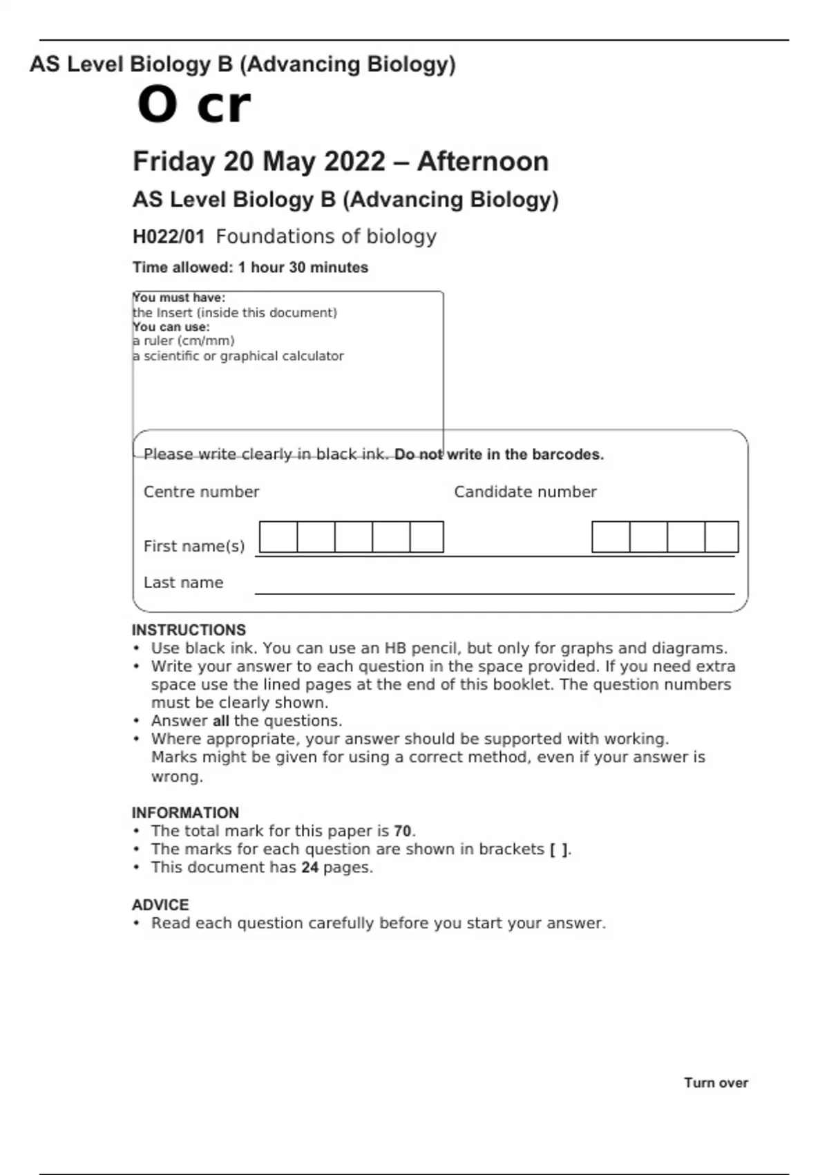 OCR AS Level Biology B (Advancing Biology) H022/01 : Foundations of Biology