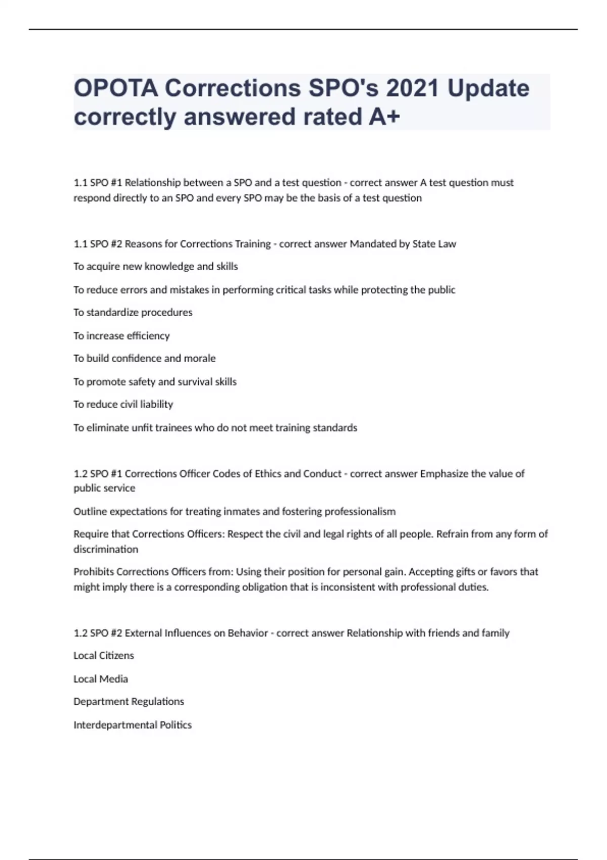 OPOTA Corrections SPO's 2021 Update correctly answered rated A+1.1 SPO #1 Relationship between a SPO and a test question - correct answer A test question must respond directly to an SPO and every SPO may be the basis of a test question 1.1 SPO #2 Reasons for Corrections Training - correct answer Mandated by State Law To acquire new knowledge and skills To reduce errors and mistakes in performing critical tasks while protecting the public To standardize procedures To increase efficiency To build confidence and morale To promote safety and survival skills To reduce civil liability To eliminate unfit trainees who do not meet training standards 1.2 SPO #1 Corrections Officer Codes of Ethics and Conduct - correct answer Emphasize the value of public service Outline expectations for treating inmates and fostering professionalism Require that Corrections Officers: Respect the civil and legal rights of all people. Refrain from any form of discrimination Prohibits Corrections Officers from: Using their position for personal gain. Accepting gifts or favors that might imply there is a corresponding obligation that is inconsistent with professional duties. 1.2 SPO #2 External Influences on Behavior - correct answer Relationship with friends and family Local Citizens Local Media Department Regulations Interdepartmental Politics Agency Subculture Officer's own ethical and moral beliefs and values Anger, Greed, and Lust: Internal rationalizations made prior to or after misconduct 1.2 SPO #3 Steps in Decision Making Model and Application of PLUS Filters - correct answer Step 1: Define the problem. Being aware that how you define the problem determines where and how you will look for solutions Step 2: Identify alternative solutions available to address the problem- at a minimum three and, ideally, more than five Step 3: Evaluate the identified alternatives- list the pros and cons of each; differentiate between known facts and personal beliefs about the situation Step 4: Make the Decision Step 5: Implement the Decision Step 6: Evaluate the Decision PLUS Filters Defined P= Policies: Is it consistent with my agency's policies and procedures? L= Legal: Is it lawful?