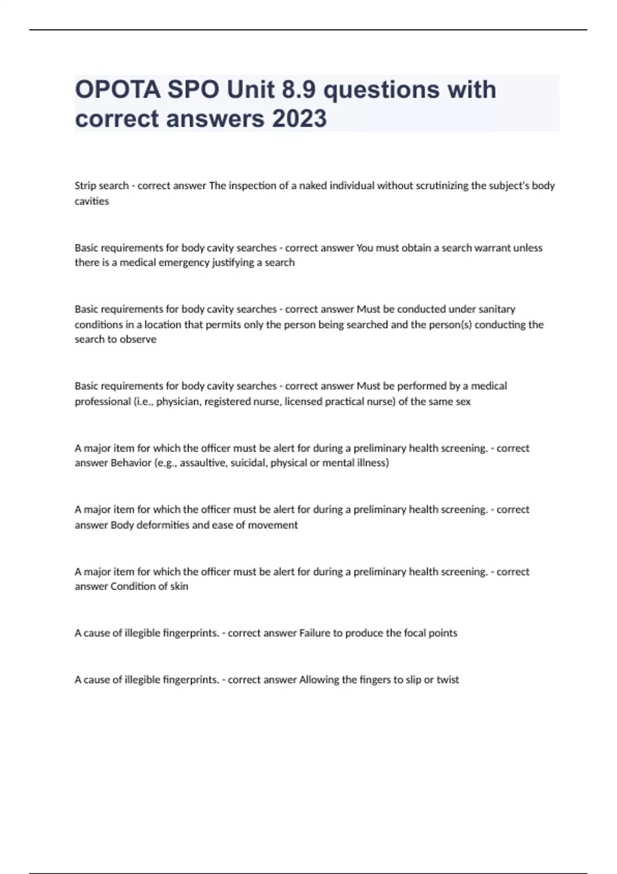 OPOTA SPO Unit 8.9 questions with correct answers 2023Strip search - correct answer The inspection of a naked individual without scrutinizing the subject's body cavities Basic requirements for body cavity searches - correct answer You must obtain a search warrant unless there is a medical emergency justifying a search Basic requirements for body cavity searches - correct answer Must be conducted under sanitary conditions in a location that permits only the person being searched and the person(s) conducting the search to observe Basic requirements for body cavity searches - correct answer Must be performed by a medical professional (i.e., physician, registered nurse, licensed practical nurse) of the same sex A major item for which the officer must be alert for during a preliminary health screening. - correct answer Behavior (e.g., assaultive, suicidal, physical or mental illness) A major item for which the officer must be alert for during a preliminary health screening. - correct answer Body deformities and ease of movement A major item for which the officer must be alert for during a preliminary health screening. - correct answer Condition of skin