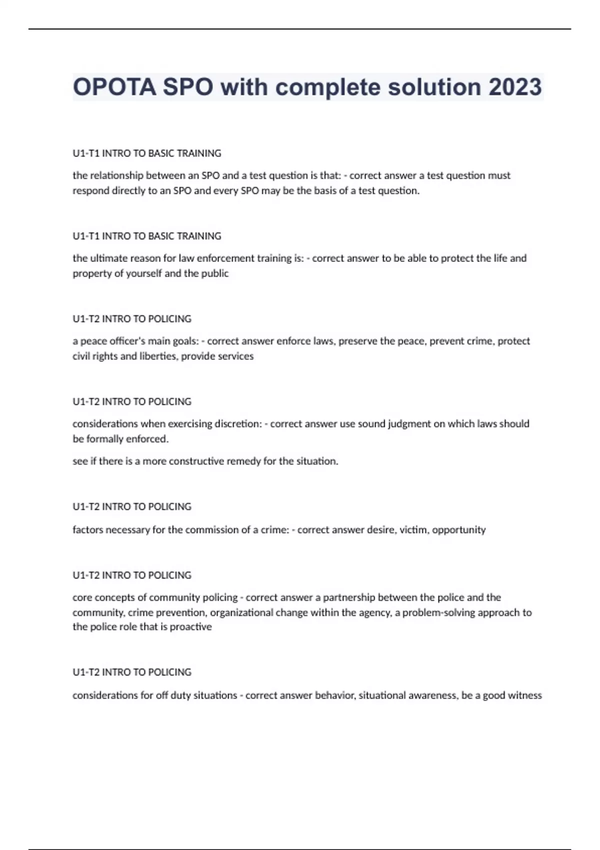 OPOTA SPO with complete solution 2023U1-T1 INTRO TO BASIC TRAINING the relationship between an SPO and a test question is that: - correct answer a test question must respond directly to an SPO and every SPO may be the basis of a test question. U1-T1 INTRO TO BASIC TRAINING the ultimate reason for law enforcement training is: - correct answer to be able to protect the life and property of yourself and the public U1-T2 INTRO TO POLICING a peace officer's main goals: - correct answer enforce laws, preserve the peace, prevent crime, protect civil rights and liberties, provide services U1-T2 INTRO TO POLICING considerations when exercising discretion: - correct answer use sound judgment on which laws should be formally enforced. see if there is a more constructive remedy for the situation. U1-T2 INTRO TO POLICING factors necessary for the commission of a crime: - correct answer desire, victim, opportunity U1-T2 INTRO TO POLICING core concepts of community policing - correct answer a partnership between the police and the community, crime prevention, organizational change within the agency, a problem-solving approach to the police role that is proactive U1-T2 INTRO TO POLICING considerations for off duty situations - correct answer behavior, situational awareness, be a good witness U1-T3 FUNDAMENTALS OF THE CRIMINAL JUSTICE SYSTEM the purposes of the bill of rights - correct answer protect an individual's freedoms, prevent the government from interfering in protected rights U1-T3 FUNDAMENTALS OF THE CRIMINAL JUSTICE SYSTEM the major components of the criminal justice system - correct answer law enforcement, courts, corrections U1-T3 FUNDAMENTALS OF THE CRIMINAL JUSTICE SYSTEM the goals of sentencing - correct answer to punish/rehabilitate the offender protect society to restore the victim as much as possible U1-T5 ETHICS AND PROFESSIONALISM the purpose of any code of ethics or code of conduct - correct answer to identify expected behavior U1-T5 ETHICS AND PROFESSIONALISM generally accepted ethical responsibilities of peace officers - correct answer to your community and citizens, profession, agency, family, self