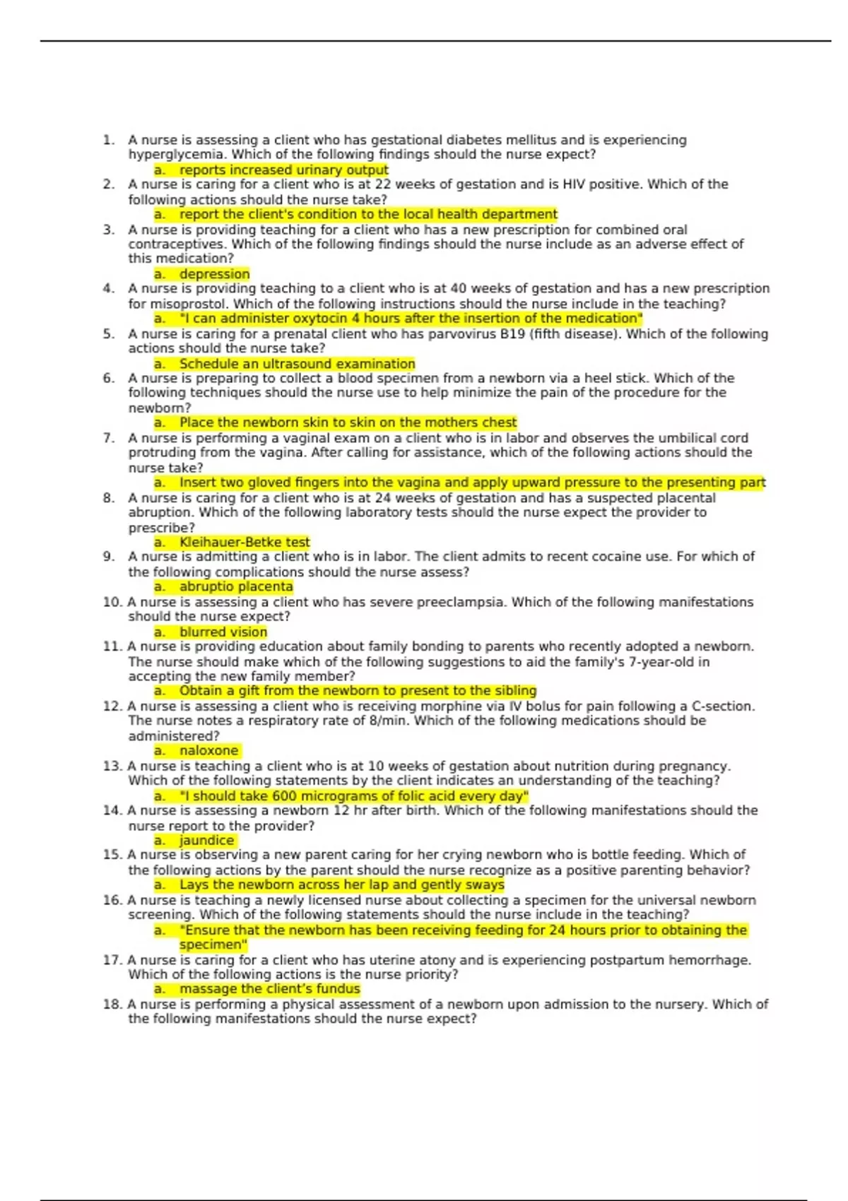 OB_Practice_Assessment _2019_ATI. 1. A nurse is assessing a client who has gestational diabetes mellitus and is experiencing hyperglycemia. Which of the following findings should the nurse expect? a. reports increased urinary output 2. A nurse is caring for a client who is at 22 weeks of gestation and is HIV positive. Which of the following actions should the nurse take? a. report the client's condition to the local health department 3. A nurse is providing teaching for a client who has a new prescription for combined oral contraceptives. Which of the following findings should the nurse include as an adverse effect of this medication? a. depression 4. A nurse is providing teaching to a client who is at 40 weeks of gestation and has a new prescription for misoprostol. Which of the following instructions should the nurse include in the teaching? a. "I can administer oxytocin 4 hours after the insertion of the medication" 5. A nurse is caring for a prenatal client who has parvovirus B19 (fifth disease). Which of the following actions should the nurse take? a. Schedule an ultrasound examination 6. A nurse is preparing to collect a blood specimen from a newborn via a heel stick. Which of the following techniques should the nurse use to help minimize the pain of the procedure for the newborn? a. Place the newborn skin to skin on the mothers chest 7. A nurse is performing a vaginal exam on a client who is in labor and observes the umbilical cord protruding from the vagina. After calling for assistance, which of the following actions should the nurse take? a. Insert two gloved fingers into the vagina and apply upward pressure to the presenting part 8. A nurse is caring for a client who is at 24 weeks of gestation and has a suspected placental abruption. Which of the following laboratory tests should the nurse expect the provider to prescribe? a. Kleihauer-Betke test 9. A nurse is admitting a client who is in labor. The client admits to recent cocaine use. For which of the following complications should the nurse assess? a. abruptio placenta 10. A nurse is assessing a client who has severe preeclampsia. Which of the following manifestations should the nurse expect? a. blurred vision 11. A nurse is providing education about family bonding to parents who recently adopted a newborn. The nurse should make which of the following suggestions to aid the family's 7-year-old in accepting the new family member? a. Obtain a gift from the newborn to present to the sibling 12. A nurse is assessing a client who is receiving morphine via IV bolus for pain following a C-section. The nurse notes a respiratory rate of 8/min. Which of the following medications should be administered? a. naloxone 13. A nurse is teaching a client who is at 10 weeks of gestation about nutrition during pregnancy. Which of the following statements by the client indicates an understanding of the teaching? a. "I should take 600 micrograms of folic acid every day" 14. A nurse is assessing a newborn 12 hr after birth. Which of the following manifestations should the nurse report to the provider? a. jaundice 15. A nurse is observing a new parent caring for her crying newborn who is bottle feeding. Which of the following actions by the parent should the nurse recognize as a positive parenting behavior? a. Lays the newborn across her lap and gently sways 16. A nurse is teaching a newly licensed nurse about collecting a specimen for the universal newborn screening. Which of the following statements should the nurse include in the teaching? a. "Ensure that the newborn has been receiving feeding for 24 hours prior to obtaining the specimen" 17. A nurse is caring for a client who has uterine atony and is experiencing postpartum hemorrhage. Which of the following actions is the nurse priority? a. massage the client’s fundus 18. A nurse is performing a physical assessment of a newborn upon admission to the nursery. Which of the following manifestations should the nurse expect? a. Acrocyanosis b. Positive Babinski reflex c. Two umbilical arteries visible 19. A nurse is demonstrating to a client how to bathe their newborn. In which order should the nurse perform the following actions? a. Wipe eyes b. Wash Neck c. Cleanse skin around umbilical cord stump d. Wash legs and feet e. Clean diaper area 20. A nurse is assessing a client who received carboprost for postpartum hemorrhage. Which of the following findings is an adverse effect of this medication? a. hypertension 21. A nurse is caring for a client who is at 35 weeks of gestation and is undergoing a nonstress test that reveals a variable deceleration in the FHR. Which of the following actions should the nurse take? a. have the client change positions 22. A nurse is caring for a client who is at 38 weeks of gestation. Which of the following actions should the nurse take prior to applying an external transducer for fetal monitoring? a. perform Leopold maneuvers 23. A nurse in a prenatal clinic is assessing a group of clients. Which of the following clients should the nurse see first? a. a client who is 11 weeks gestation and reports abdominal cramping 24. A nurse is caring for a client who is at 32 weeks of gestation and has gonorrhea. The nurse should identify that the client is at an increased risk for which of the following complications? a. premature rupture of membranes 25. A nurse is assessing four newborns. Which of the following findings should the nurse report to the provider? a. A newborn who is 18 hr old and has an axillary temperature of 99.9° F 26. A nurse is caring for a postpartum client who is receiving heparin via a continuous IV infusion for thrombophlebitis in her left calf. Which of the following actions should the nurse take? a. maintain the client off bed rest 27. A nurse is providing discharge teaching to a client who had a cesarean birth 3 days ago. Which of the following instructions should the nurse include? a. "You can still become pregnant if you are breastfeeding" 28. A