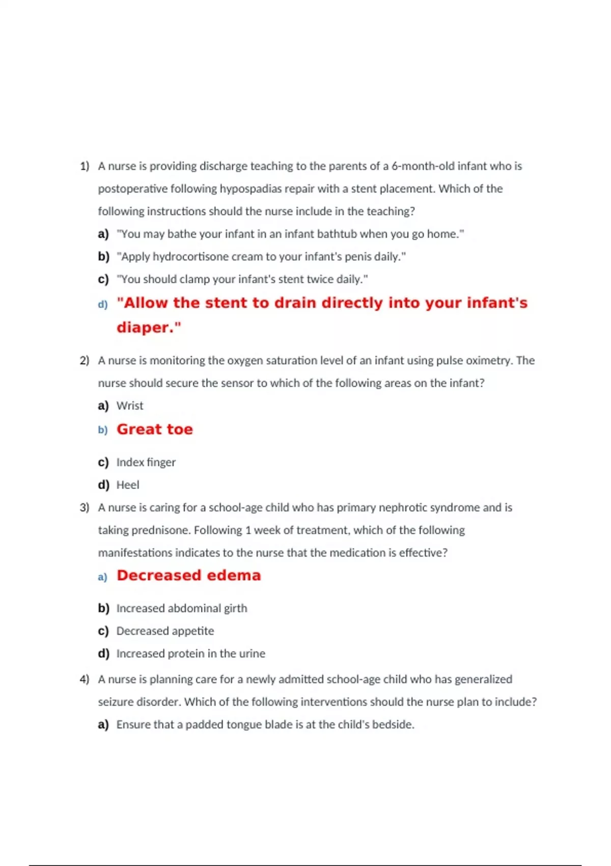 ATI-PN Peds_Exam_2021. 1) A nurse is providing discharge teaching to the parents of a 6-month-old infant who is postoperative following hypospadias repair with a stent placement. Which of the following instructions should the nurse include in the teaching? a) "You may bathe your infant in an infant bathtub when you go home." b) "Apply hydrocortisone cream to your infant's penis daily." c) "You should clamp your infant's stent twice daily." d) "Allow the stent to drain directly into your infant's diaper." 2) A nurse is monitoring the oxygen saturation level of an infant using pulse oximetry. The nurse should secure the sensor to which of the following areas on the infant? a) Wrist b) Great toe c) Index finger d) Heel 3) A nurse is caring for a school-age child who has primary nephrotic syndrome and is taking prednisone. Following 1 week of treatment, which of the following manifestations indicates to the nurse that the medication is effective? a) Decreased edema b) Increased abdominal girth c) Decreased appetite d) Increased protein in the urine 4) A nurse is planning care for a newly admitted school-age child who has generalized seizure disorder. Which of the following interventions should the nurse plan to include? a) Ensure that a padded tongue blade is at the child's bedside. b) Allow the child to play video games on a tablet computer. c) Allow the child to take a tub bath independently. d) Ensure the oxygen source is functioning in the child's room. 5) A nurse is receiving change-of-shift report for four children. Which of the following children should the nurse assess first? a) A toddler who has a concussion and an episode of forceful vomiting b) An adolescent who has infective endocarditis and reports having a headache c) An adolescent who was placed into halo traction 1 hr ago and reports pain as 6 on a scale of 0 to 10 d) A school-age child who has acute glomerulonephritis and brown-colored urine 6) A nurse is providing dietary teaching to the guardian of a school-age child who has cystic fibrosis. Which of the following statements should the nurse make? a) "You should offer your child high-protein meals and snacks throughout the day." b) "You should decrease your child's dietary fat intake to less than 10% of their caloric intake." c) "You should restrict your child's calorie intake to 1,200 per day." d) "You should give your child a multivitamin once weekly." 7) A nurse assessing a school-age child who has an infratentorial brain tumor. Which of the following findings should the nurse identify as a manifestation of increased intracranial pressure? a) Hypotension b) Reports insomnia c) Difficulty concentrating d) Tachycardia 8) A nurse is providing teaching to an adolescent about how to manage tinea pedis. Which of the following statements by the adolescent indicates an understanding of the teaching? a) "I should buy plastic shoes to wear at the swimming pool." b) "I should wear sandals as much as possible." c) "I should place the permethrin cream between my toes twice daily." d) "I should seal my nonwashable shoes in plastic bags for a couple of weeks." 9) A nurse is caring for a school-age child who has diabetes mellitus and was admitted with a diagnosis of diabetic ketoacidosis. When performing the respiratory assessment, which of the following findings should the nurse expect? a) Deep respirations of 32/min b) Shallow respirations of 10/min c) Paradoxic respirations of 26/min d) Periods of apnea lasting for 20 seconds 10) A nurse is planning n educational program to teach parents about protecting their children from sunburns. Which of the following instructions should the nurse plan to include? a) "Allow your child to play outside during the hours between 10:00 a.m. and 2:00 p.m." b) "Choose a waterproof sunscreen with a minimum SPF of 15." c) "Dress your child in loose weave polyester fabric prior to sun exposure." d) "Reapply sunscreen every 4 hours." 11) A nurse is providing teaching to the parents of a preschooler who has heart failure and a new prescription for digoxin twice daily. Which of the following instructions should the nurse include in the teaching? a) "Use a kitchen teaspoon to measure the medication." b) "Brush the child's teeth after giving the medication." c) "Double the next dose if the child misses a dose." d) "Repeat the dose if the child vomits." 12) A nurse is providing teaching to the family of a school-age child who has juvenile idiopathic arthritis. Which if the following instructions should the nurse include in the teaching? a) "Limit movement of the child's large joints." b) "Encourage the child to perform independent selfcare." c) "Provide the child with a soft mattress for sleeping." d) "Schedule a 2-hour daily nap for the child in the afternoon." 13) A nurse is creating a plan of care for a child who has varicella. Which of the following interventions should the nurse include? a) Maintain the child's room temperature at 80° F. b) Prepare the child for a lumbar puncture. c) Administer aspirin to the child for a temperature greater than 38.3° C (101° F). d) Initiate airborne precautions for the child. 14) A nurse is assessing a school-age child who has an acute spinal cord injury following a sports injury 1 week ago. Identify the area the nurse should tap to elicit the bicep reflect. i) Correct answer is A 15) A school nurse is providing an in-service for faculty about improving education for students who have ADHD. Which of the following statements by a faculty member indicates an understanding of the teaching? a) "I will plan to increase the amount of homework I assign to students who have ADHD." b) "I will give students who have ADHD the same amount of time as other students to complete tests." c) "I will allow students who have ADHD one rest break throughout the day." d) "I will teach challenging academic subjects to students who have ADHD in the morning."