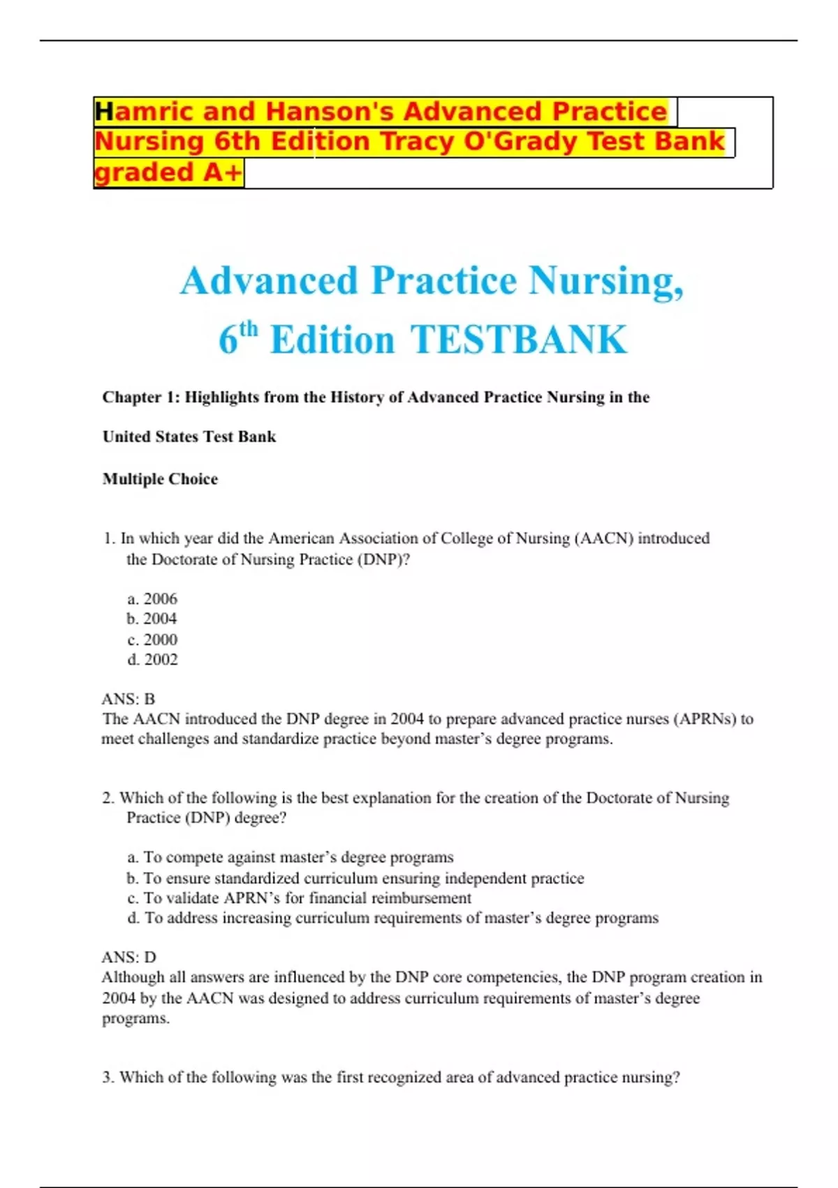 hamric and hansons advanced practice nursing 6th edition tracy ogrady test bank graded a