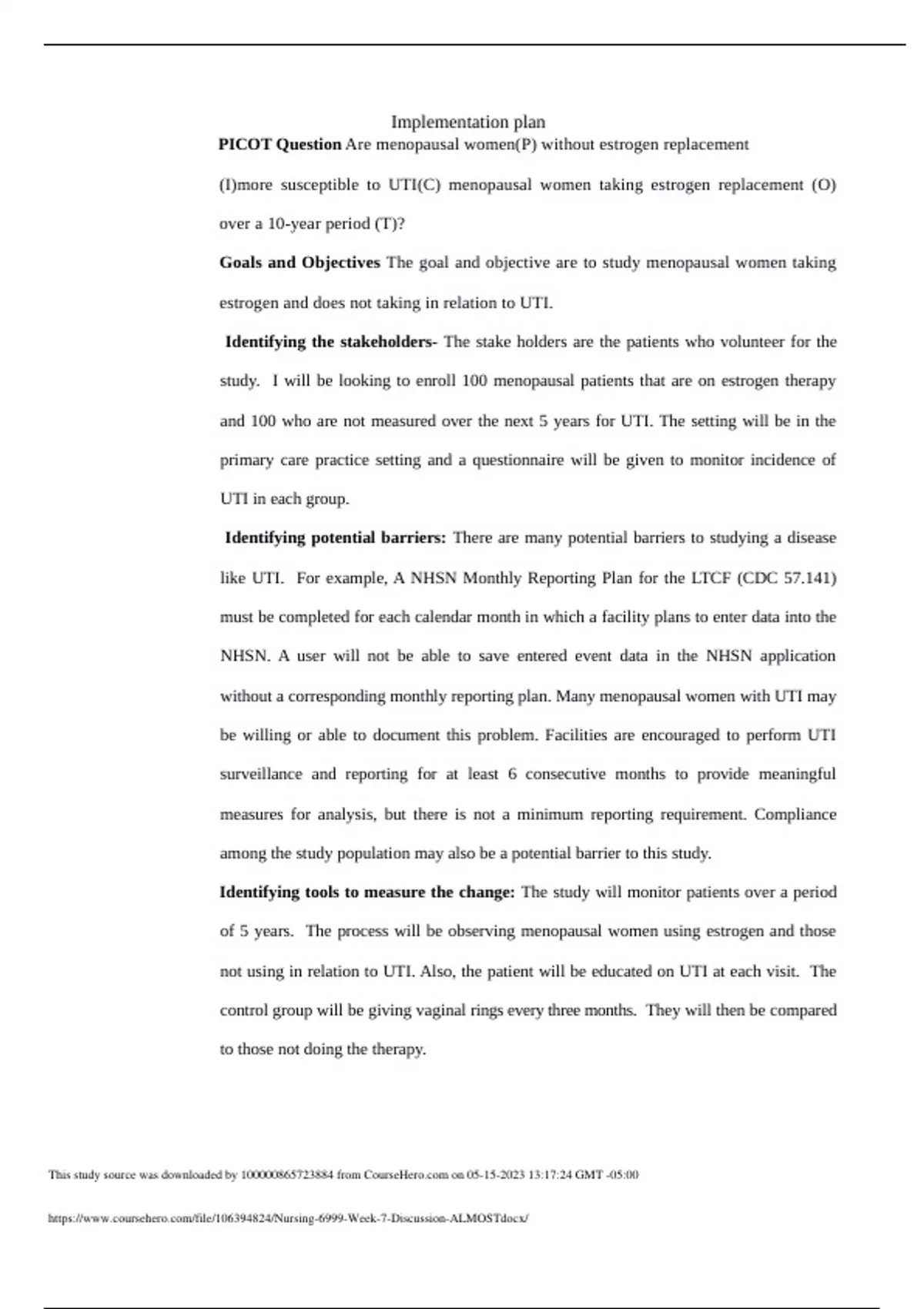 Implementation plan PICOT Question Are menopausal women(P) without estrogen replacement (I)more susceptible to UTI(C) menopausal women taking estrogen replacement (O) over a 10-year period (T)? Goals and Objectives The goal and objective are to study menopausal women taking estrogen and does not taking in relation to UTI. Identifying the stakeholders- The stake holders are the patients who volunteer for the study. I will be looking to enroll 100 menopausal patients that are on estrogen therapy and 100 who are not measured over the next 5 years for UTI. The setting will be in the primary care practice setting and a questionnaire will be given to monitor incidence of UTI in each group. Identifying potential barriers: There are many potential barriers to studying a disease like UTI. For example, A NHSN Monthly Reporting Plan for the LTCF (CDC 57.141) must be completed for each calendar month in which a facility plans to enter data into the NHSN. A user will not be able to save entered event data in the NHSN application without a corresponding monthly reporting plan. Many menopausal women with UTI may be willing or able to document this problem. Facilities are encouraged to perform UTI surveillance and reporting for at least 6 consecutive months to provide meaningful measures for analysis, but there is not a minimum reporting requirement. Compliance among the study population may also be a potential barrier to this study. Identifying tools to measure the change: The study will monitor patients over a period of 5 years. The process will be observing menopausal women using estrogen and those not using in relation to UTI. Also, the patient will be educated on UTI at each visit. The control group will be giving vaginal rings every three months. They will then be compared to those not doing the therapy