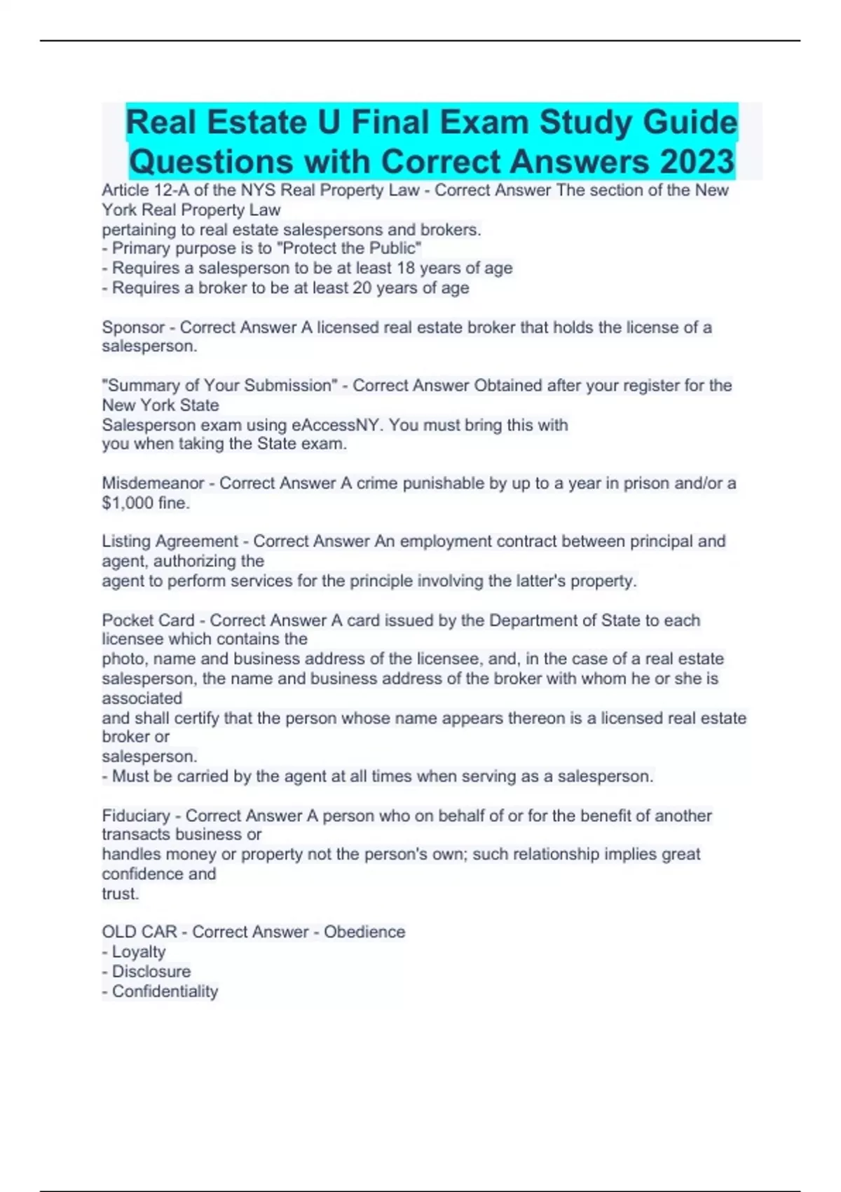 Real Estate U Final Exam Study Guide Questions with Correct Answers 2023