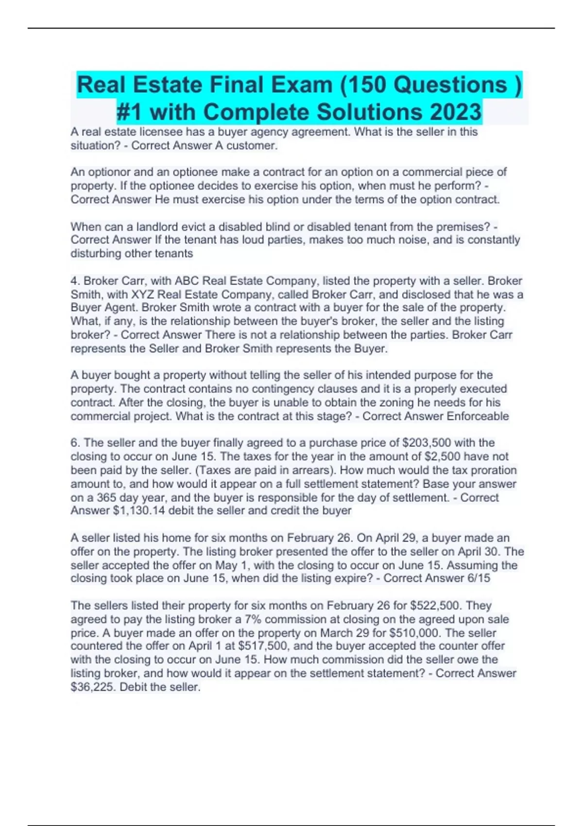 Real Estate Final Exam (150 Questions ) #1 with Complete Solutions 2023 A real estate licensee has a buyer agency agreement. What is the seller in this situation? - Correct Answer A customer. An optionor and an optionee make a contract for an option on a commercial piece of property. If the optionee decides to exercise his option, when must he perform? - Correct Answer He must exercise his option under the terms of the option contract. When can a landlord evict a disabled blind or disabled tenant from the premises? - Correct Answer If the tenant has loud parties, makes too much noise, and is constantly disturbing other tenants 4. Broker Carr, with ABC Real Estate Company, listed the property with a seller. Broker Smith, with XYZ Real Estate Company, called Broker Carr, and disclosed that he was a Buyer Agent. Broker Smith wrote a contract with a buyer for the sale of the property. What, if any, is the relationship between the buyer's broker, the seller and the listing broker? - Correct Answer There is not a relationship between the parties. Broker Carr represents the Seller and Broker Smith represents the Buyer. A buyer bought a property without telling the seller of his intended purpose for the property. The contract contains no contingency clauses and it is a properly executed contract. After the closing, the buyer is unable to obtain the zoning he needs for his commercial project. What is the contract at this stage? - Correct Answer Enforceable 6. The seller and the buyer finally agreed to a purchase price of $203,500 with the closing to occur on June 15. The taxes for the year in the amount of $2,500 have not been paid by the seller. (Taxes are paid in arrears). How much would the tax proration amount to, and how would it appear on a full settlement statement? Base your answer on a 365 day year, and the buyer is responsible for the day of settlement. - Correct Answer $1,130.14 debit the seller and credit the buyer A seller listed his home for six months on February 26. On April 29, a buyer made an offer on the property. The listing broker presented the offer to the seller on April 30. The seller accepted the offer on May 1, with the closing to occur on June 15. Assuming the closing took place on June 15, when did the listing expire? - Correct Answer 6/15 The sellers listed their property for six months on February 26 for $522,500. They agreed to pay the listing broker a 7% commission at closing on the agreed upon sale price. A buyer made an offer on the property on March 29 for $510,000. The seller countered the offer on April 1 at $517,500, and the buyer accepted the counter offer with the closing to occur on June 15. How much commission did the seller owe the listing broker, and how would it appear on the settlement statement? - Correct Answer $36,225. Debit the seller.