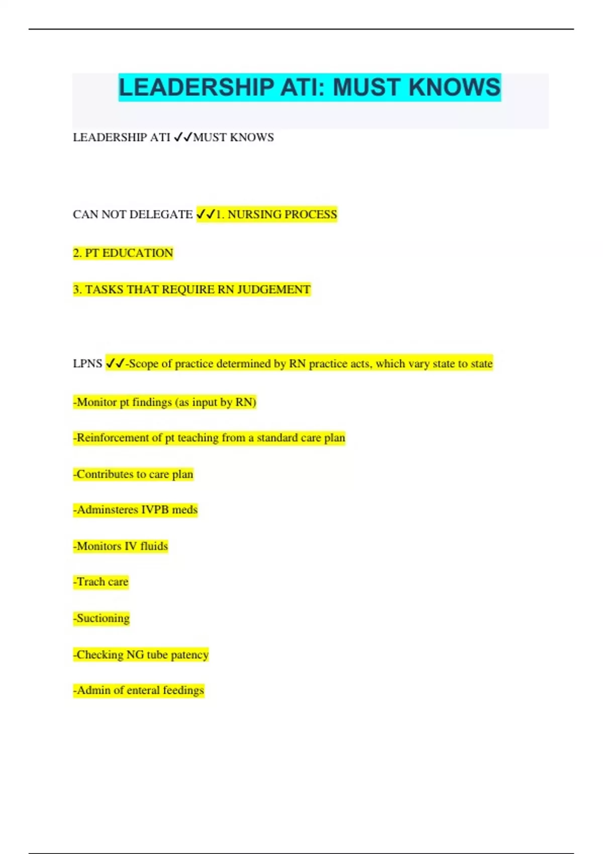 LEADERSHIP ATI: MUST KNOWS LEADERSHIP ATI MUST KNOWS CAN NOT DELEGATE 1. NURSING PROCESS 2. PT EDUCATION 3. TASKS THAT REQUIRE RN JUDGEMENT LPNS -Scope of practice determined by RN practice acts, which vary state to state -Monitor pt findings (as input by RN) -Reinforcement of pt teaching from a standard care plan -Contributes to care plan -Adminsteres IVPB meds -Monitors IV fluids -Trach care -Suctioning -Checking NG tube patency -Admin of enteral feedings -Insertion of urinary catheter -Med admin (excluding IV meds in many states) AP -ADLS: Grooming, bathing, dressing, toileting, ambulating, feeding (without swallowing precautions!!!), positioning, bed making -Specimen collection -I&O -VS on STABLE pts -Assemble pt med records -Maintain safe env -Recognize situations to report to immediate superior -CAN NOT DO DRESSING CHANGES NURSE STAGES 1. NOVICE=Student or new grad 2. ADVANCED BEGINNER=Most New RNs 3. COMPETENT=2-3 yrs experience 4. PROFICIENT=Signif amt of experience; holistic care 5. EXPERT=Do not need to rely on rules TB -Neg pressure -particulate (HEPA) masks -Airborne precautions CANNOT CONSENT -Schitzophrenia -15 yr old -Dementia OK: BAL .05 QUANTITATIVE -Phenomenology QUANTITATIVE -Meta analysis -Experimental study -Secondary analysis MED TIMES -Ok to give 30 min early FROM COMPREHENSIVE FROM COMPREHENSIVE PHASES OF MANAGEMENT PROCESS -Planning -Organzing -Staffing -Directing -Controlling PRIORITIZATION PRINCIPLES 1. LIFE BEFORE LIMB EX: Shock over pt w limb inj 2. ACUTE BEFORE CHRONIC 3. ACTUAL BEFORE POTENTIAL 4. MASLOWS: SELSP 5. EMERGENCIES VS. EXPECTED FINDINGS BUDGETS PERSONAL=Worked time and benefit time OPERATING=Electricity, maintenance, and supplies CAPITAL BUDGET=Buildings or major equipt ETHICAL PRINCIPLES VIDELITY=Be faithful; keep promises NONMALEFICIENCE=Not to do hard VERACITY=Tell the truth ANA CODE OF ETHICS -Sets guidelines to use when providing pt care -Outlines RN resp to pt and profession of nursing -Assists the RN in making ethical decisions ORGAN DONATION -Regualted by state and fed laws -RN must present option of organ donation to all fams ADVANCE DIRECTIVE =Doc in which pt who is competent is able to express wished re: future acceptable health care (including the desire for extraordinary lifesaving measures: CPR, intubation, and artificial hydration or nut) -Able to designate another person to make dec when the pt becomes physically or mentally unable to do so LIVING WILL =Legal doc that instructs health care providers and fam members about what, if any, life-sustaining tx an individual wants if at some time the ind is unable to make dec DURABLE POA =Legal doc that desgnates another person to make health care dec for pt when pt becomes unable to make dec independently INFORMED CONSENT -RN must witness signature -CAN provide clarification to info already given by MD -CANNOT provide NEW info TYPES OF LAWS AND COURTS 1. CRIMINAL LAW -Felony-Major -Misdemenaor-Minor 2. CIVIL LAWS TORT LAW: 1. UNINTENTIONAL TORTL=Negligence, malplactice 2. QUASI-INTENTAIONAL=Breach of confidentiality, defamation of char 3. INTENTIONAL TORT=Assault (threat), battery (touch), false imprisonment CONT'D 3. STATE LAWS=Nursing pracitce reg by state law. Each board of RN ahs rules reg and stand that vary FEDERAL REGS=Hippa, ADA, etc. MALPRACTICE =Failure to act in reasonable and prudent manner NEGLIGENCE =Omission to do something that a reasonable person would do OR =Doing something that a resonable person would NOT do -Standard of pro practice is developed by prof. organizations ASSIGNING =Process of transferring auth, accountability, and resp of pt care to another member of the health care tea DELEGATING =Process of tranferring auth and resp to another team member to complete a task while retaining accountability SUPERVISING =Process of directing, monitoring, and evaluating the performance of tasks by another team member of the health care team -RNs resp for supervision of pt care tasks delegated to AP adn LPNS also knowsn as UAP and LVN 5 RIGHTS OF DELEGATION 1. TASK=What task should be delegated 2. CIRCUMSTANCE=Under what circumstances 3. PERSON=To whom 4. DIRECTION/COMMUNICATOIN=What info should be communicated 5. RIGHT SUPERVISOIN/EVAL=How to supervise/evaluate` AVODIING/WITHDRAWGIN -Both parties knowthres conflict but refuse to face it or fix -May be approp for minor confl when 1 part holds more power than other of is issue may worl itself out over time -BC conflict remains, it may surface again at later data and escalate over time -Usually LOSE LOSE sit SMOOTHING -1 party attempts to smooth another party by trying to satisfy the other party -Often used to preserve or maintain a peaceful work env -This focus may be on what is agreed upon, leaving conflict largely unresvoled -LOSE LOSE sit COMPETING/COERCING -1 party pursues a desired solution at the expense of others -Managers may use this when a quick or unpopular dec must be made -Party who loses something may experince anger, aggrevation, and desire for retibution -WIN-LOSE sit COOPERATING/ACCOMADATING -1 party sacrifices something, allowing the other party to get what it wants -Opposite of competing -Original prob may not actually be resolved -Solution may contribute to future conflict -LOSE-WIN sit COMPROMISING/NEGOTIATING -Each party gives something up -To consider this a WIN/LOSE WIN/LOSe sit, both parties must give up something equally imp -If 1 party give up more than the other, it can become a WIN-LOSE sit ORDER OF GENERATIONS 1. VETERAN 2. BABY BOOMER 3. GENERATION X 4. GENERATION Y DEC MAKING DECISIVE=Min, one option FLEXIBLE=Limited, several option HIERARCHIAL=Large, one option INTEGRATIVE=Large, several option TEAM 1. FORMING=Get to know; ledaer defines tasks for team and offers directoin 2. STORMING=Conflict arises, and team mem begin to express polarized viewe -Team est rules, and members begin to take on various roles 3. NORMING=Team est rule; members show respect for on eanother and begin to accomplish 