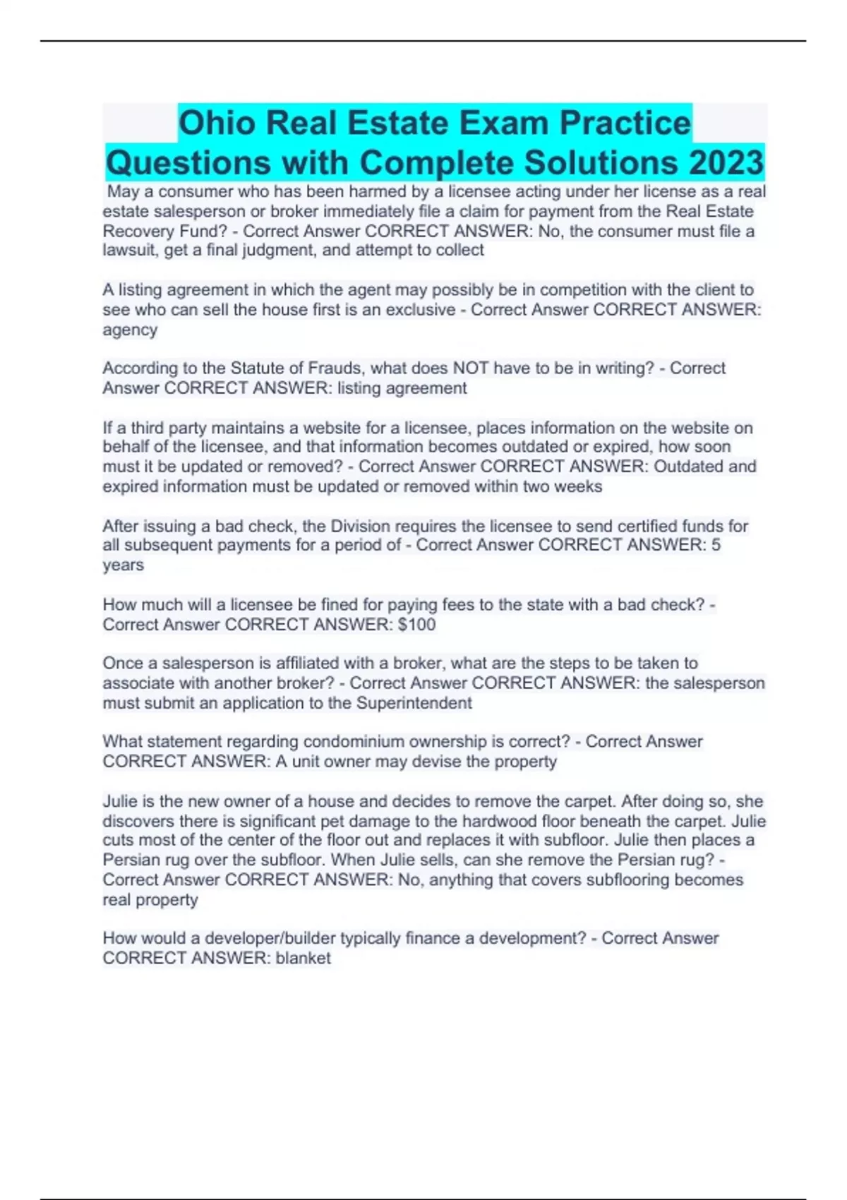 Ohio Real Estate Exam Practice Questions with Complete Solutions 2023 May a consumer who has been harmed by a licensee acting under her license as a real estate salesperson or broker immediately file a claim for payment from the Real Estate Recovery Fund? - Correct Answer CORRECT ANSWER: No, the consumer must file a lawsuit, get a final judgment, and attempt to collect A listing agreement in which the agent may possibly be in competition with the client to see who can sell the house first is an exclusive - Correct Answer CORRECT ANSWER: agency According to the Statute of Frauds, what does NOT have to be in writing? - Correct Answer CORRECT ANSWER: listing agreement If a third party maintains a website for a licensee, places information on the website on behalf of the licensee, and that information becomes outdated or expired, how soon must it be updated or removed? - Correct Answer CORRECT ANSWER: Outdated and expired information must be updated or removed within two weeks After issuing a bad check, the Division requires the licensee to send certified funds for all subsequent payments for a period of - Correct Answer CORRECT ANSWER: 5 years How much will a licensee be fined for paying fees to the state with a bad check? - Correct Answer CORRECT ANSWER: $100 Once a salesperson is affiliated with a broker, what are the steps to be taken to associate with another broker? - Correct Answer CORRECT ANSWER: the salesperson must submit an application to the Superintendent What statement regarding condominium ownership is correct? - Correct Answer CORRECT ANSWER: A unit owner may devise the property Julie is the new owner of a house and decides to remove the carpet. After doing so, she discovers there is significant pet damage to the hardwood floor beneath the carpet. Julie cuts most of the center of the floor out and replaces it with subfloor. Julie then places a Persian rug over the subfloor. When Julie sells, can she remove the Persian rug? - Correct Answer CORRECT ANSWER: No, anything that covers subflooring becomes real property How would a developer/builder typically finance a development? - Correct Answer CORRECT ANSWER: blanket