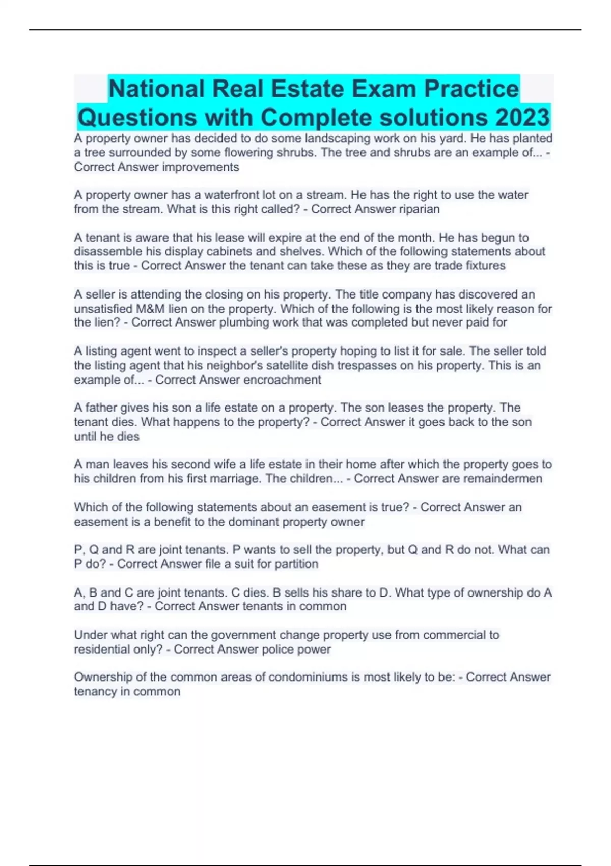 National Real Estate Exam Practice Questions with Complete solutions 2023 A property owner has decided to do some landscaping work on his yard. He has planted a tree surrounded by some flowering shrubs. The tree and shrubs are an example of... - Correct Answer improvements A property owner has a waterfront lot on a stream. He has the right to use the water from the stream. What is this right called? - Correct Answer riparian A tenant is aware that his lease will expire at the end of the month. He has begun to disassemble his display cabinets and shelves. Which of the following statements about this is true - Correct Answer the tenant can take these as they are trade fixtures A seller is attending the closing on his property. The title company has discovered an unsatisfied M&M lien on the property. Which of the following is the most likely reason for the lien? - Correct Answer plumbing work that was completed but never paid for A listing agent went to inspect a seller's property hoping to list it for sale. The seller told the listing agent that his neighbor's satellite dish trespasses on his property. This is an example of... - Correct Answer encroachment A father gives his son a life estate on a property. The son leases the property. The tenant dies. What happens to the property? - Correct Answer it goes back to the son until he dies A man leaves his second wife a life estate in their home after which the property goes to his children from his first marriage. The children... - Correct Answer are remaindermen Which of the following statements about an easement is true? - Correct Answer an easement is a benefit to the dominant property owner P, Q and R are joint tenants. P wants to sell the property, but Q and R do not. What can P do? - Correct Answer file a suit for partition A, B and C are joint tenants. C dies. B sells his share to D. What type of ownership do A and D have? - Correct Answer tenants in common Under what right can the government change property use from commercial to residential only? - Correct Answer police power Ownership of the common areas of condominiums is most likely to be: - Correct Answer tenancy in common
